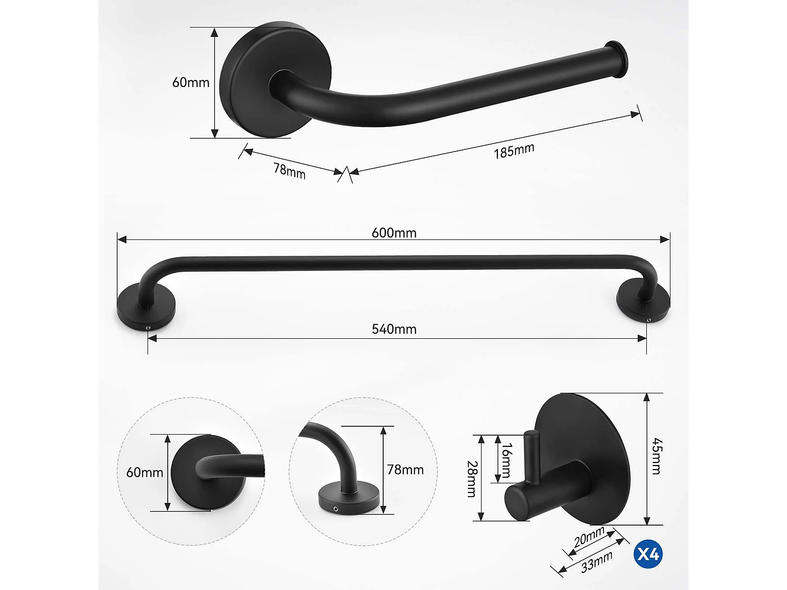 Auralum Max Accessoires Salle Bain,Acier Inoxydable,Noir, Porte Serviette Mural(1 Pièce),Porte-rouleau de Papier Toilette(1 Pièce),Crochet,(4 Pièce)