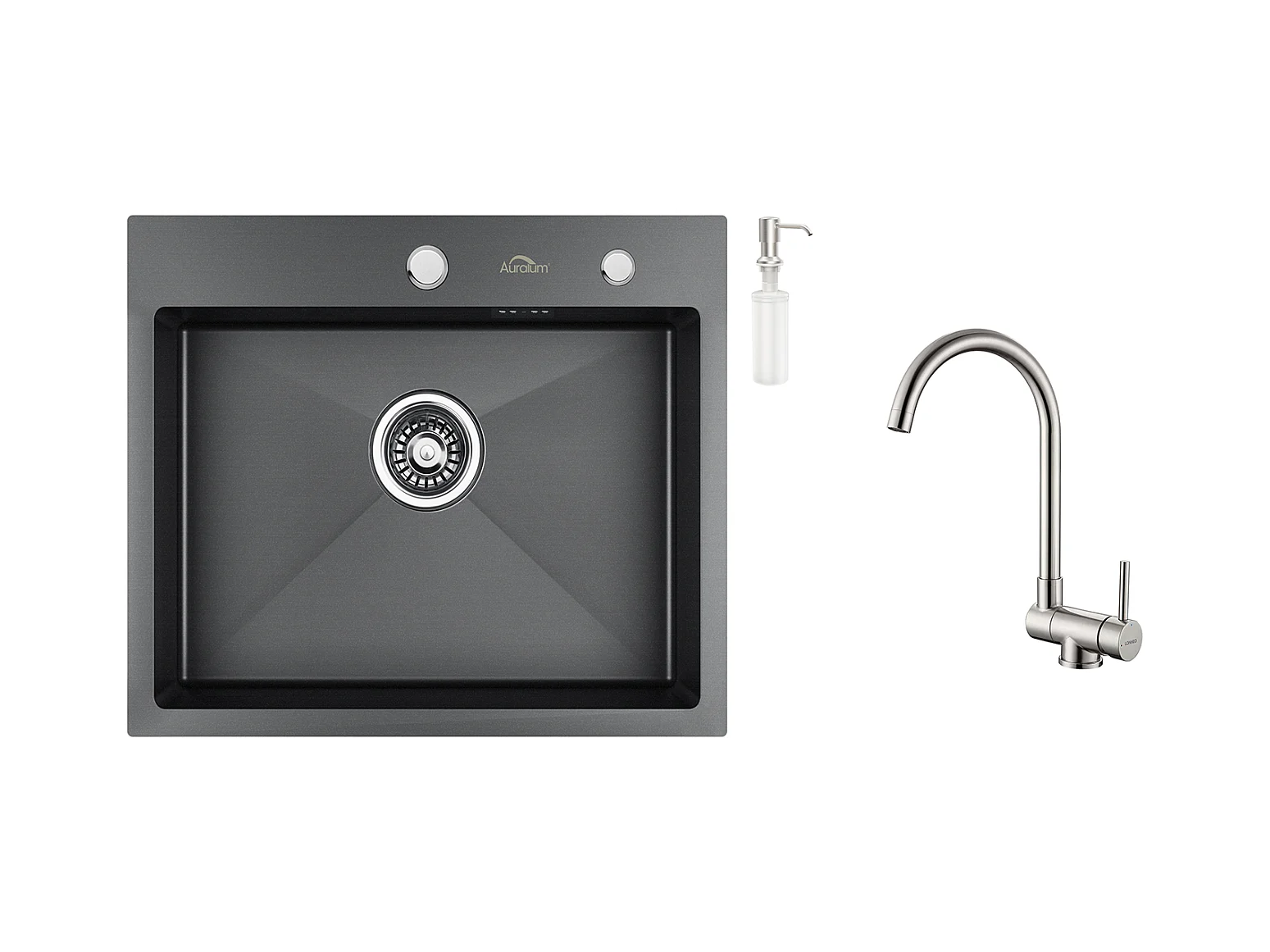 AuraLum Max Évier 1 Bac 55x45x18.5CM Évier à Encastrer Inoxydable Évier Cuisine Gris foncé avec Distrubuteur de savon/Ensemble de drainage,EU Modèle