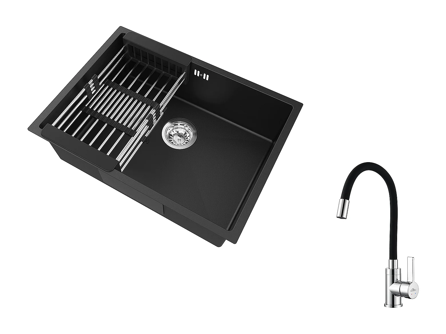 Auralum Max Évier Cuisine 1 Bac 60*44*20CM,inox 304,à Encastrer/sous-plan avec Panier Drainage,Noir+Mitigeur Évier avec Bec Flexible,Rabattable