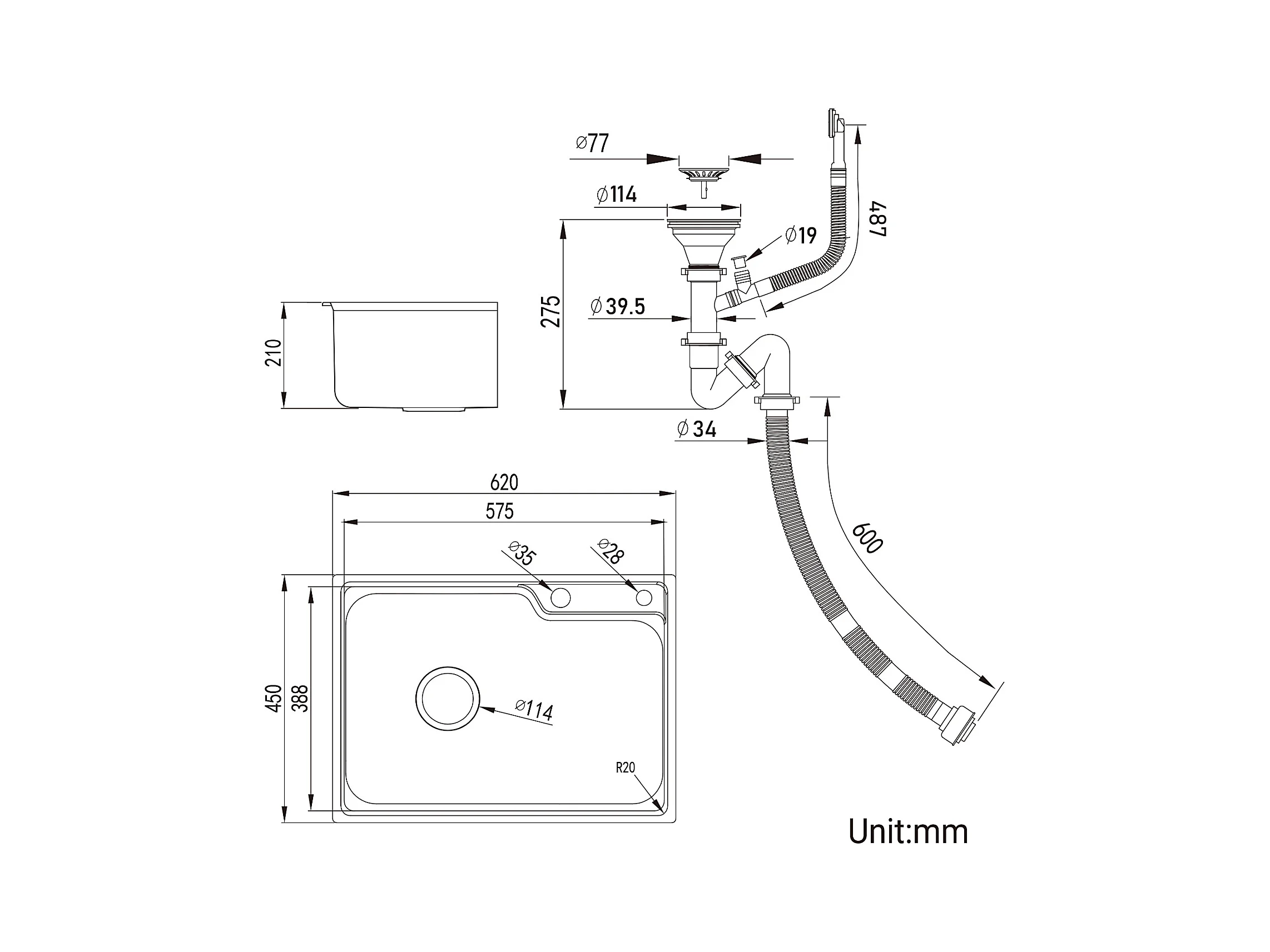 AuralumMax Évier Cuisine 1Bac 62*45*21CM Évier Cuisine en Inox PVD Nano Vasque à Poser,Argent+Robinet Cuisine Noir avec Douchette Extractible,2 Jets