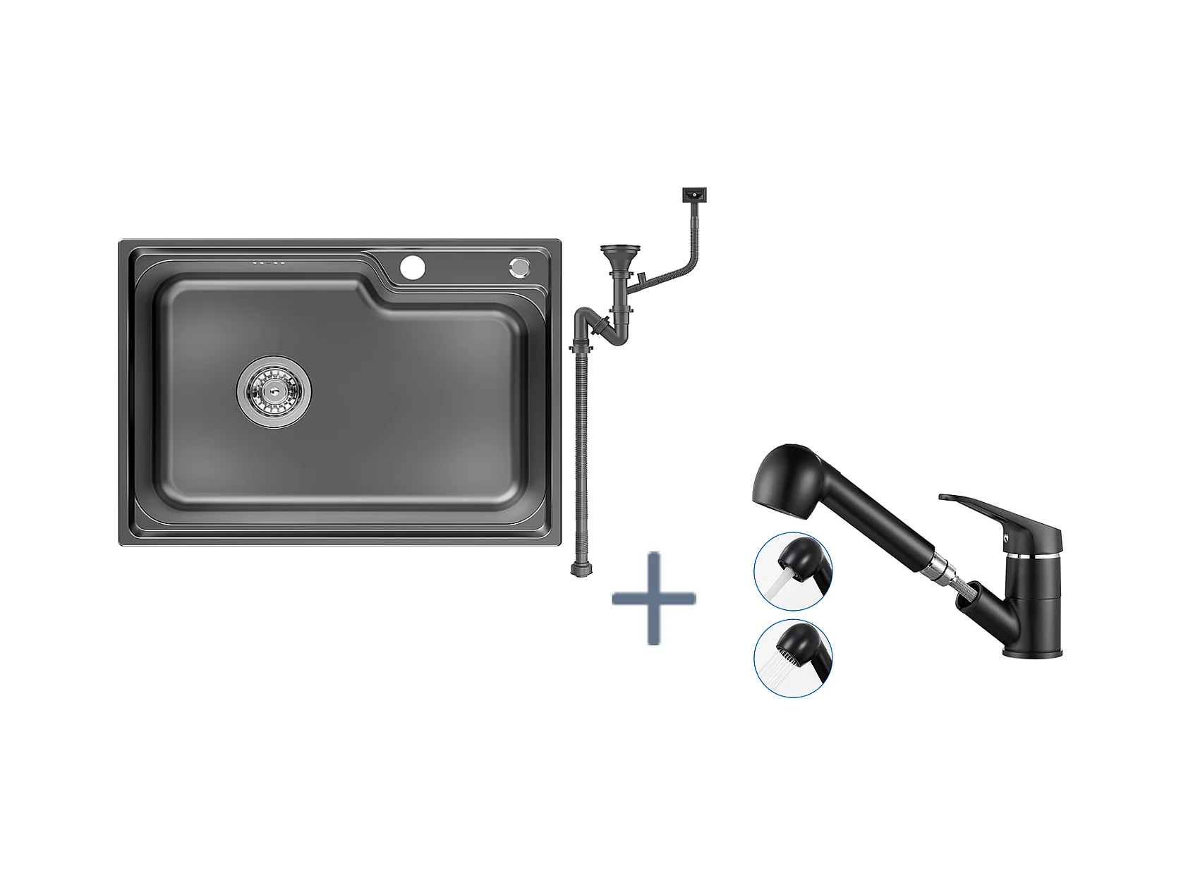 AuralumMax Évier Cuisine 1Bac 62*45*21CM,en Inox PVD Nano Vasque à Poser,Noir+Robinet Cuisine Rotatif 360° Eau Froide/Chaude,Noir avec points blancs