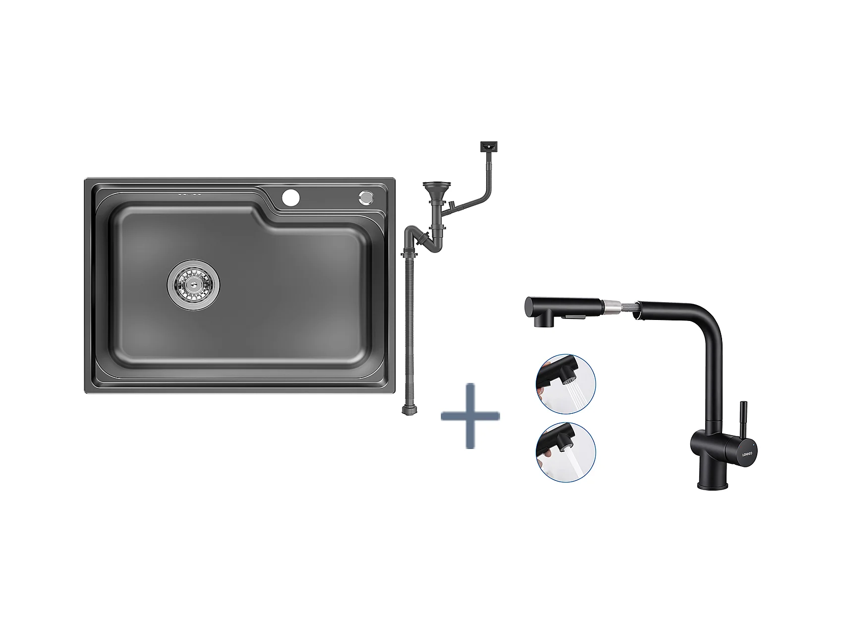 Auralum Max Évier Cuisine 1 Bac 62*45*21CM,en Inox PVD Nano Vasque à Poser,Noir+Robinet de cuisine rétractable à deux fonctions, Noir