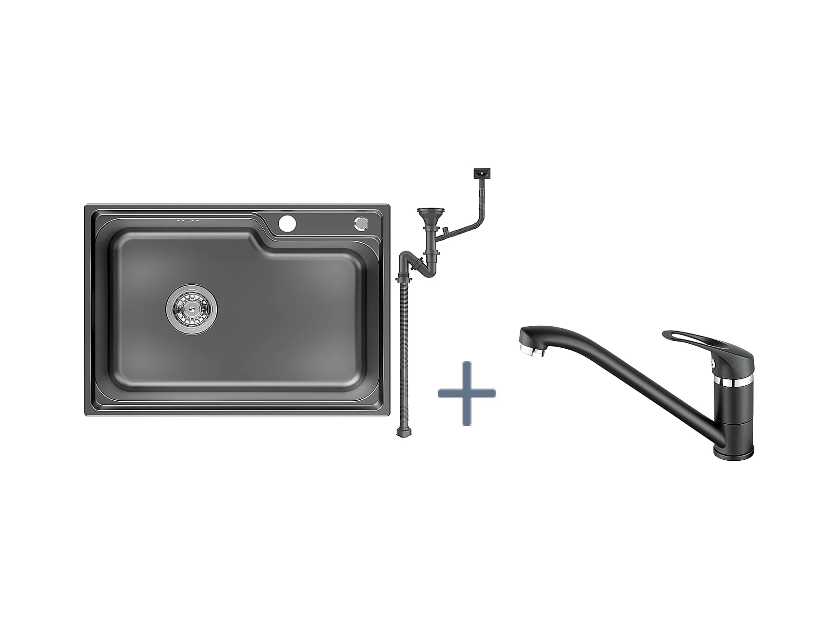 AuralumMax Évier Cuisine 1Bac 62*45*21CM,en Inox PVD Nano Vasque à Poser,Noir+Robinet Cuisine Rotatif 360° Eau Froide/Chaude,Noir avec points blancs
