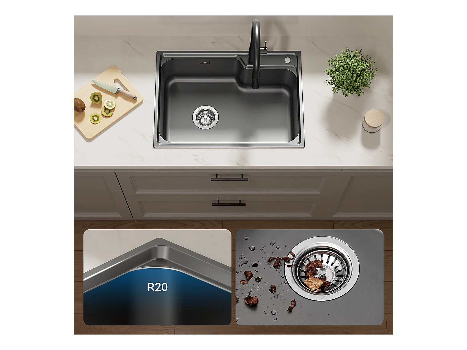 Auralum Max Évier Cuisine 1 Bac 62*45*21CM Évier de Cuisine en Acier Inoxydable PVD Nano Vasque à Poser,Gris Noir