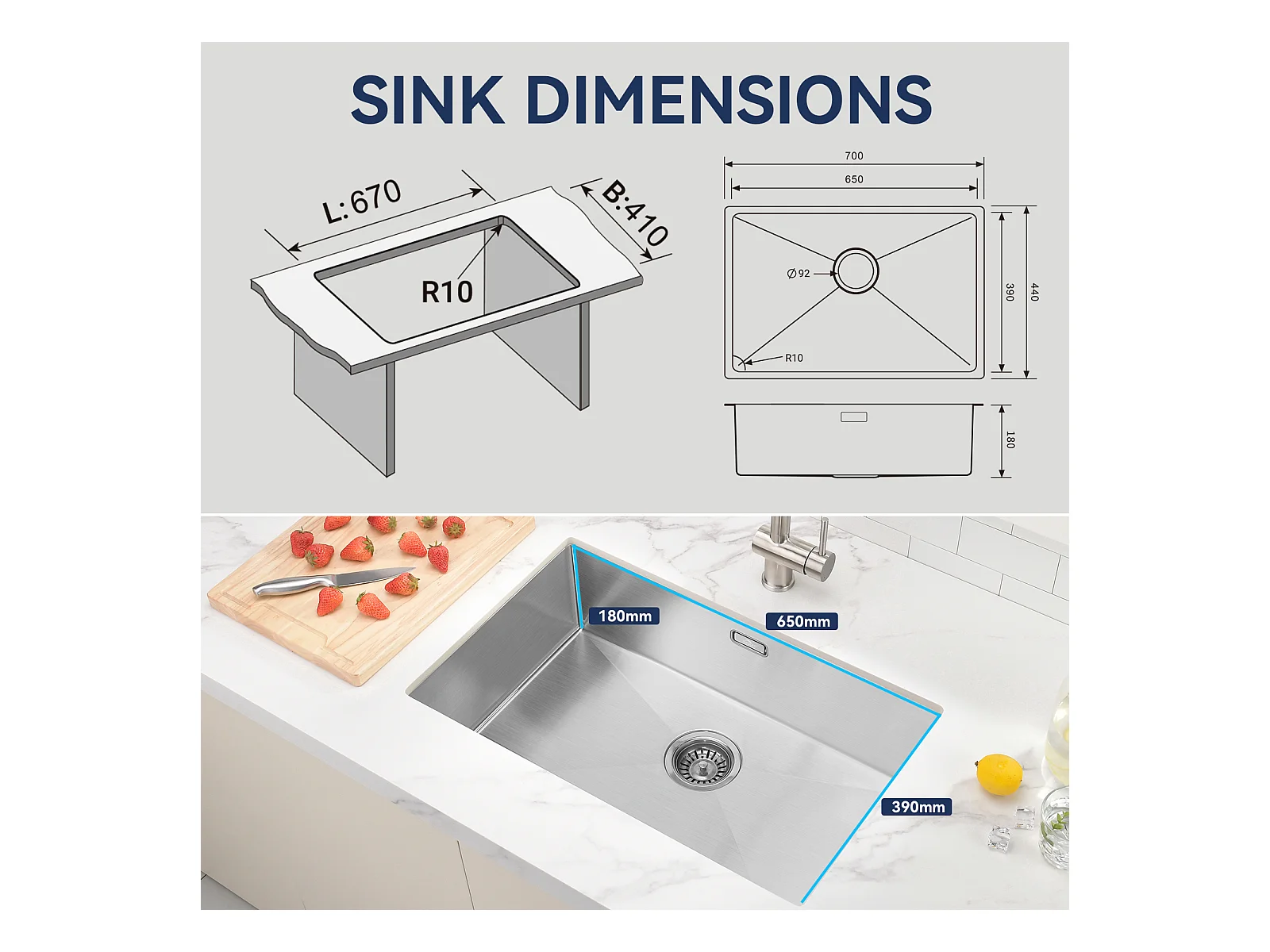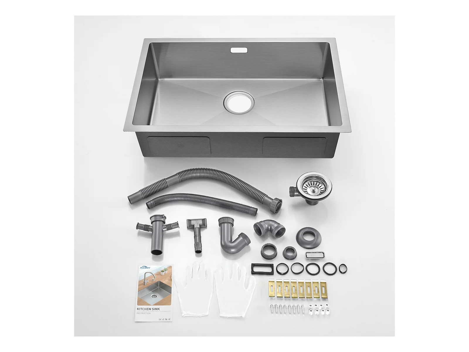 AuraLum Max Évier Cuisine 1 Bac 70*44*19CM Évier Montage à Encastrer,à Fleur/Sous-Plan Acier Inox 304 Évier Brossé avec Siphon/Trop-Plein,EU Modèle