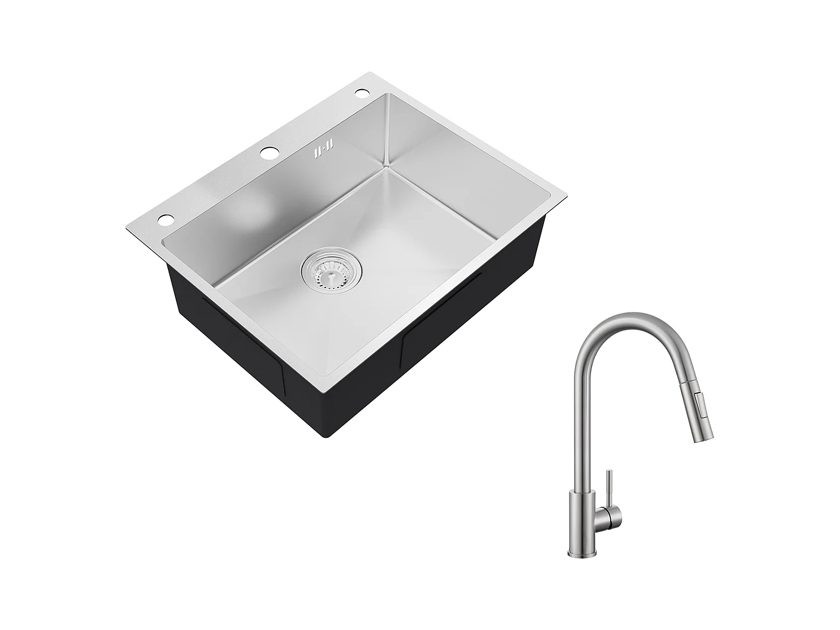 Auralum max Évier de Cuisine à Encastrer,1 Bac,60*49*20CM,Évier en inox 304,Silver+robinet de cuisine rétractable à deux fonctions, chromé