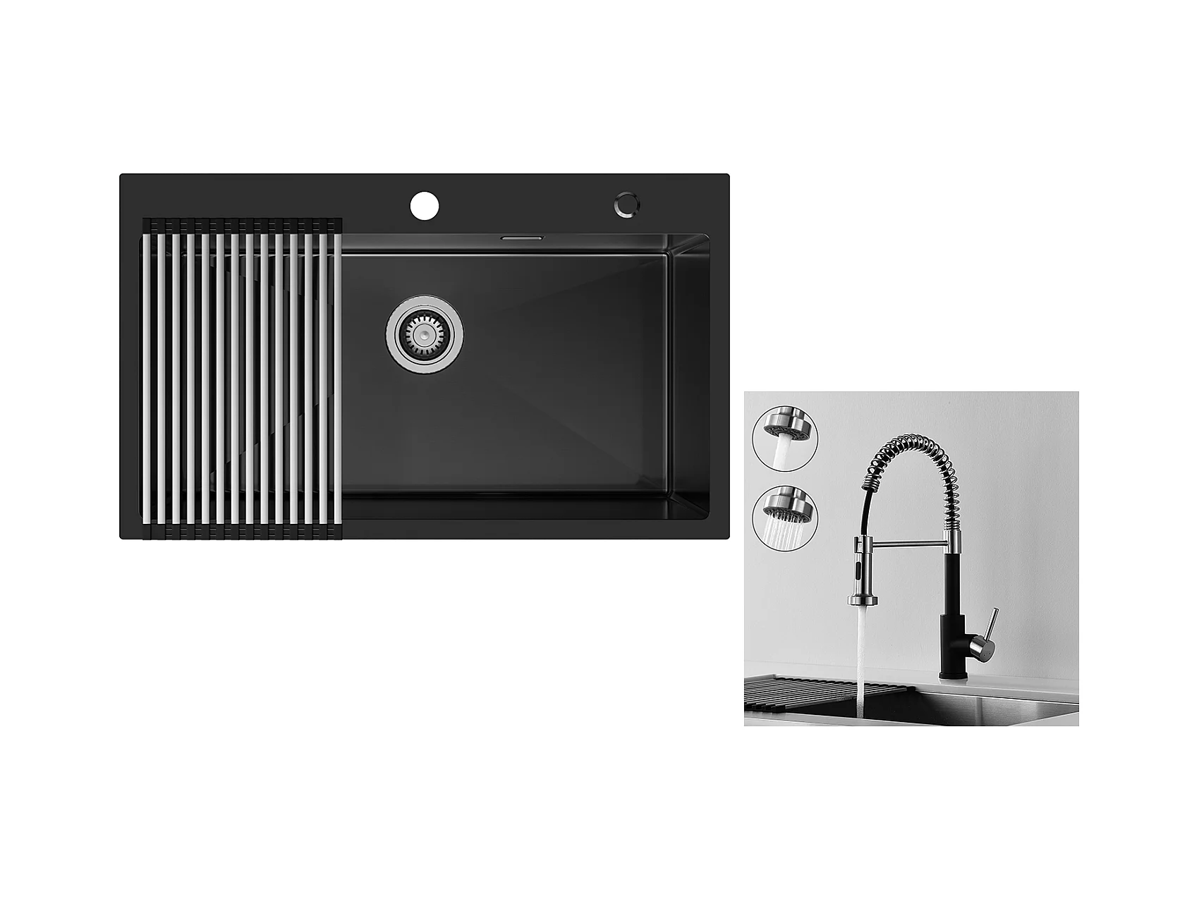 Auralum MAX Évier de Cuisine 1 Bac 75 x 45 cm,Évier Inox Noir avec Égouttoir Pliable+Robinet Cuisine Ressort avec Douchette Extensible,2 Modes,Noir