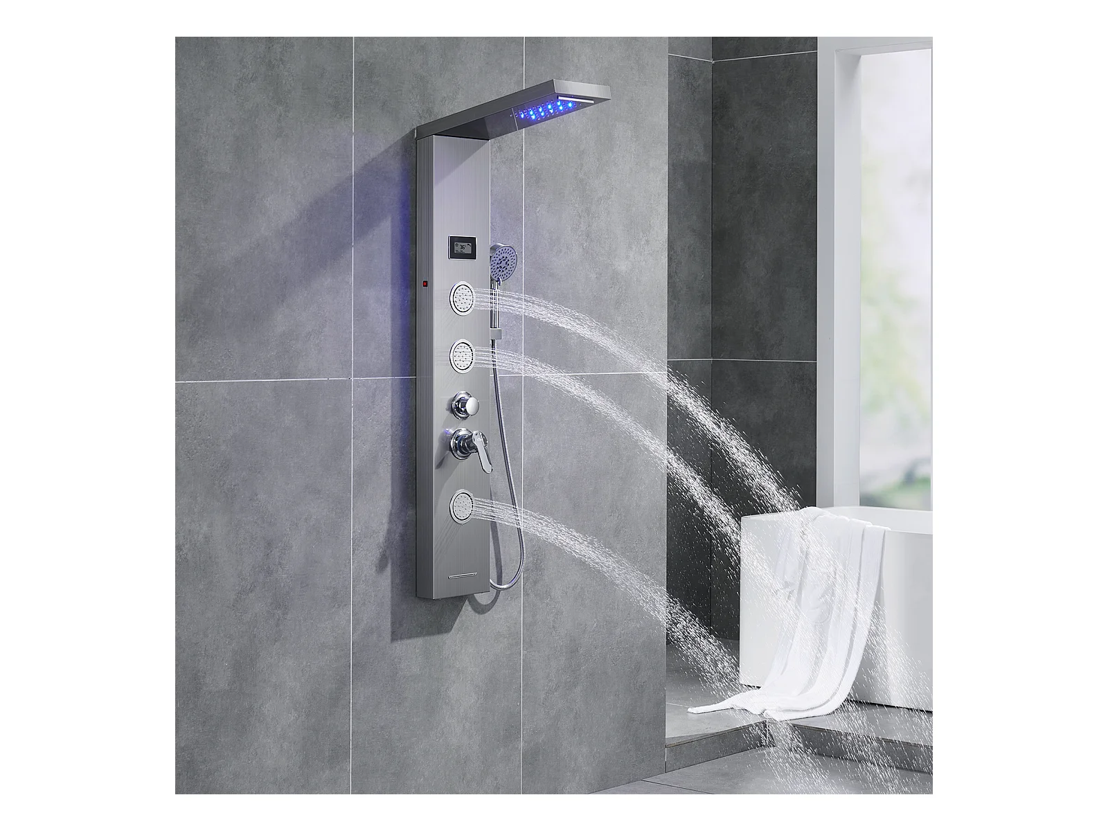 Panneau Douche LED LCD Indicateur de température,en Inox Brossé avec 3 Jets de Massage+Porte Serviette Salle Bain Adhésif/Perçage,Brossé