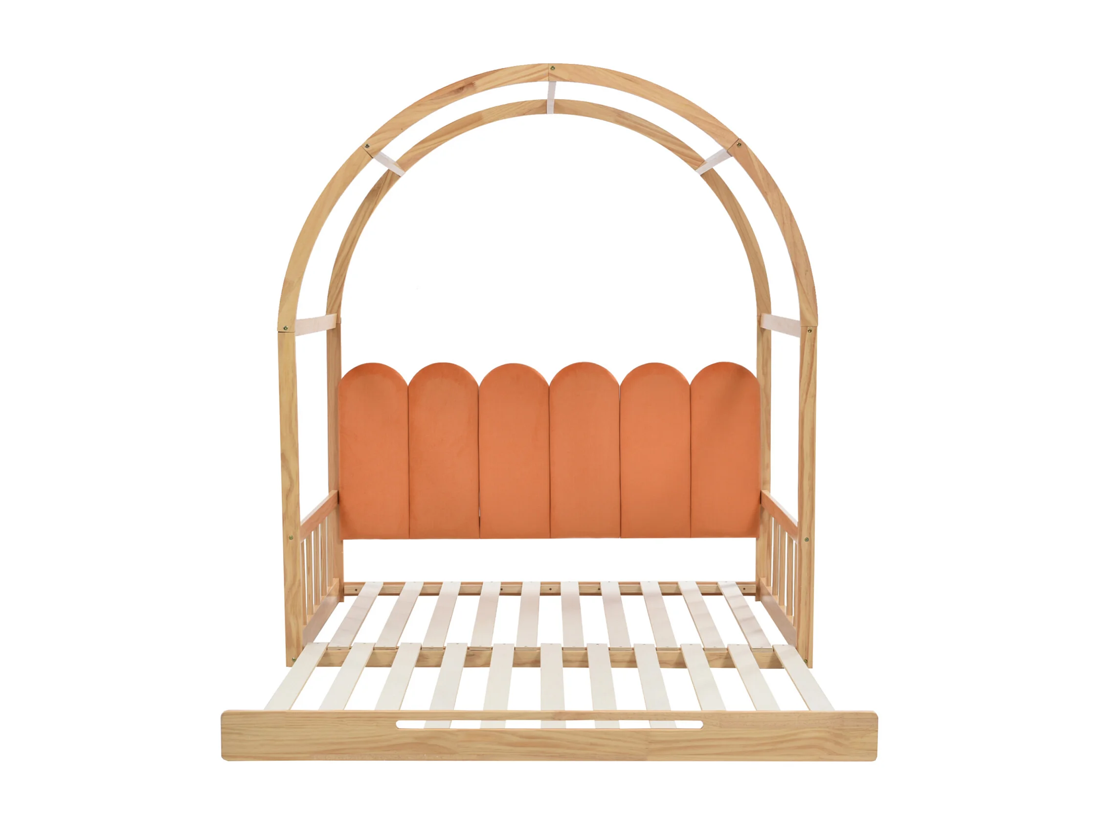 (Avec matelas) Lit mezzanine extensible, lit gigogne, lit enfant, lit sommier, lit double, coussins velours, pin, naturel + orange, 140x100/200cm