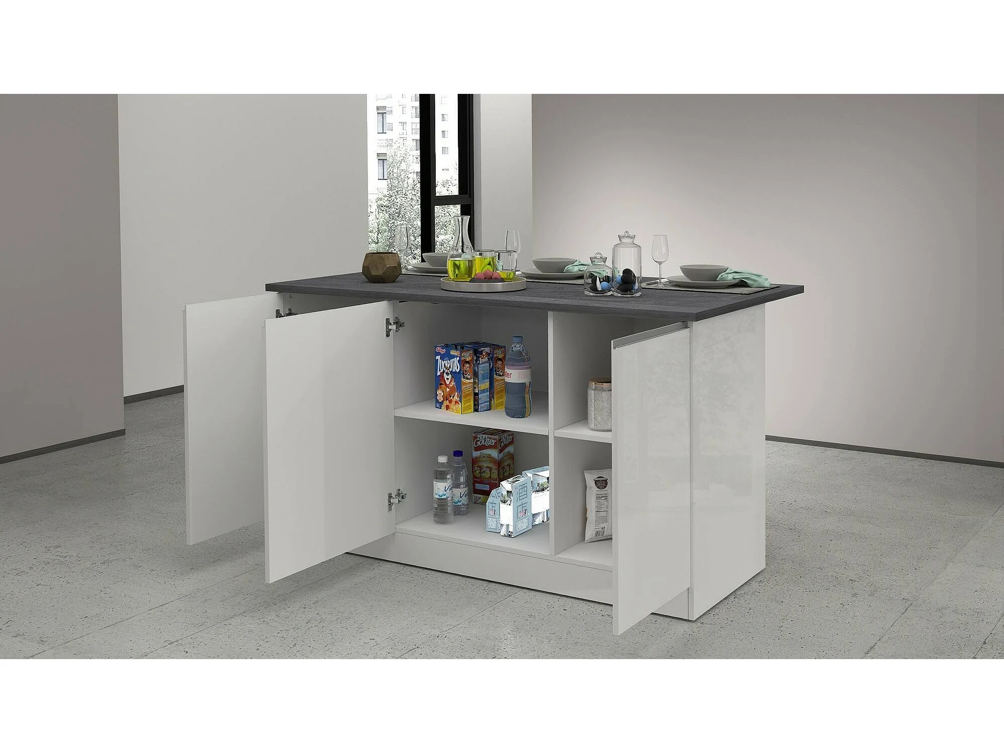 Îlot de cuisine Dcarnelo, Armoire polyvalente, Meuble de kitchenette, Table auxiliaire, 100% Made in Italy, 155x90h90 cm, Blanc brillant et ardoise