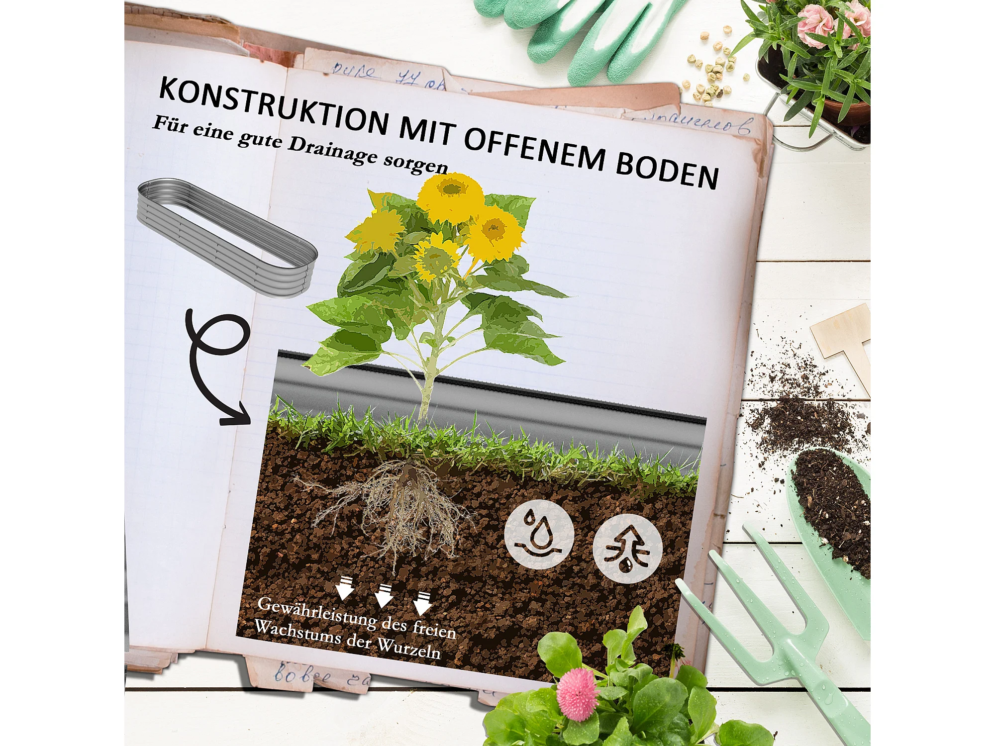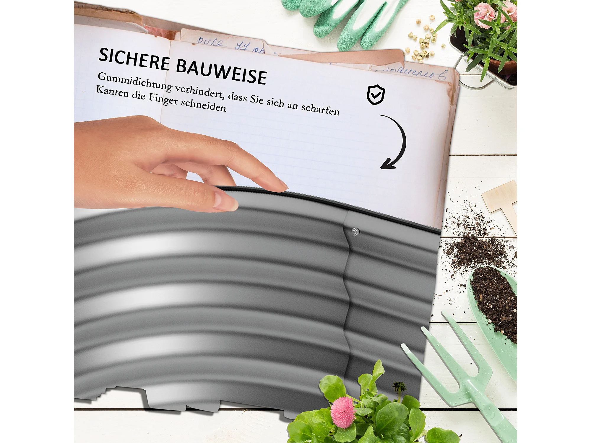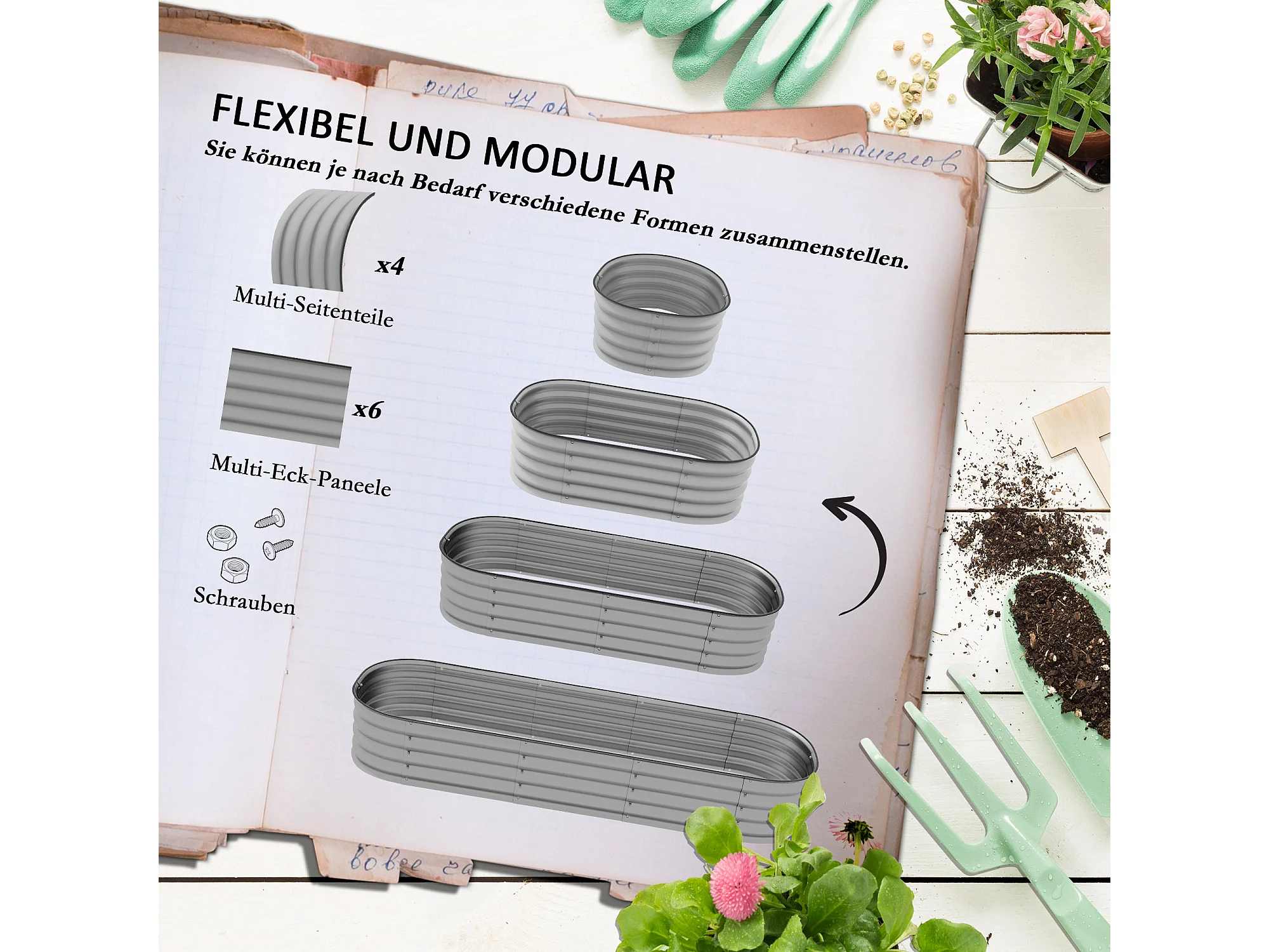 Bac à fleurs en métal avec fond ouvert, modulable, argenté (195x62x30cm)