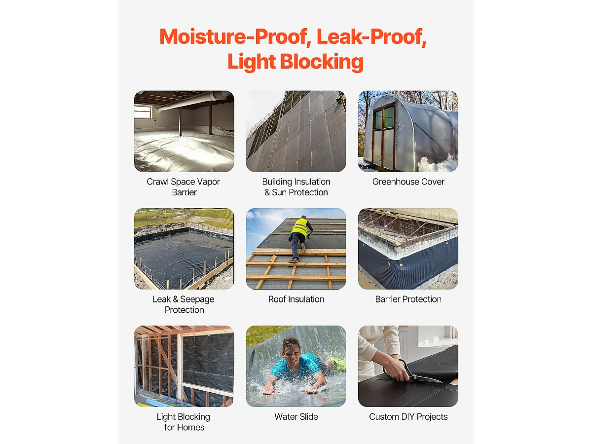 Bâche Plastique Robuste SucceBuy Rouleau de Feuille de Plastique 0.25 mm, 610 x 3048 cm, Polyéthylène Noir Très Résistant