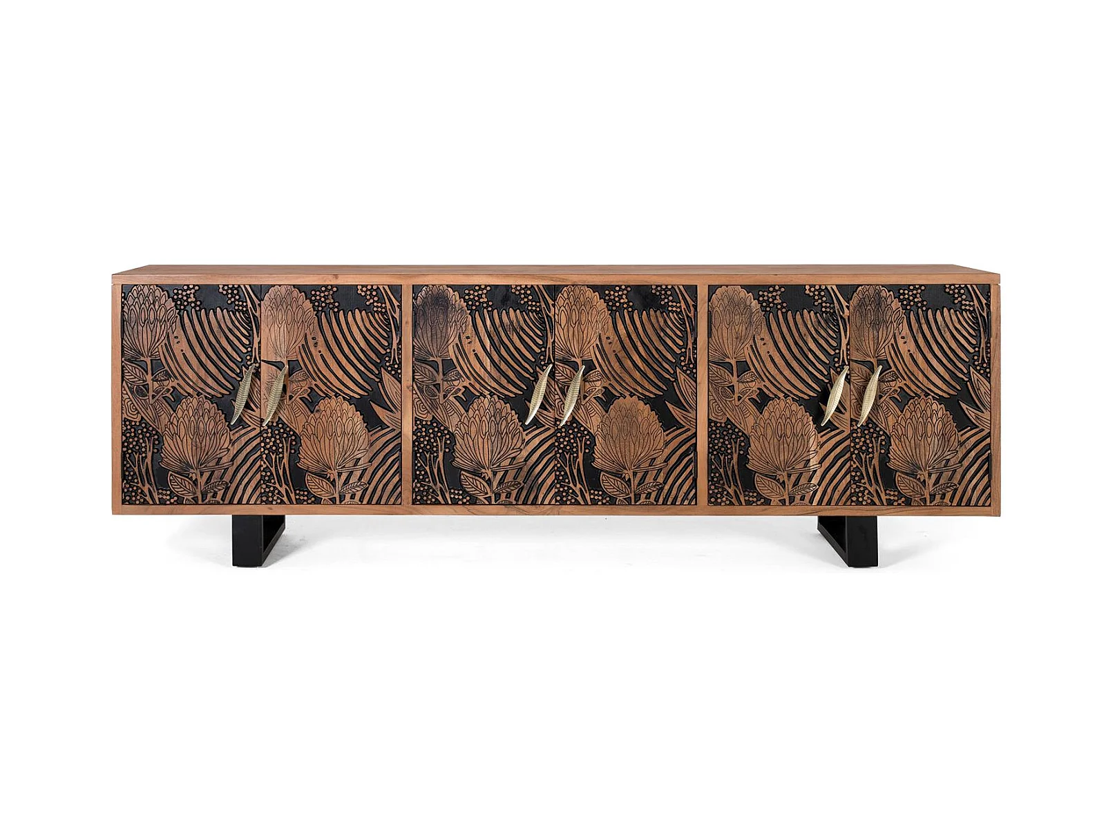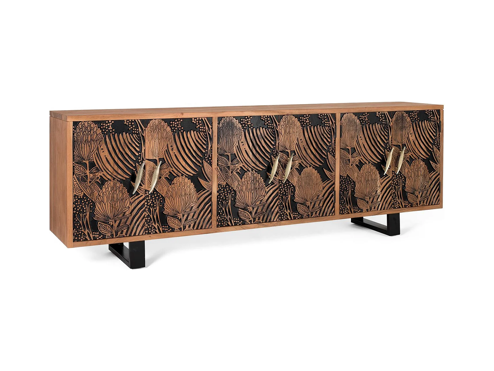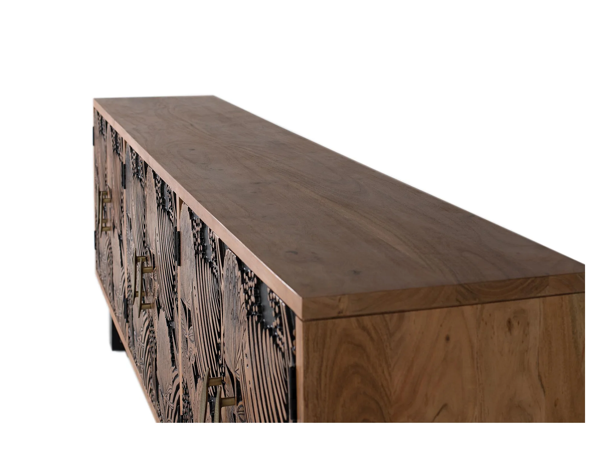 Buffet 80×40×78 cm série en noyer foncé avec relief feuilles, portes Push-to-Open et pieds en métal – Design moderne pour salon et couloir
