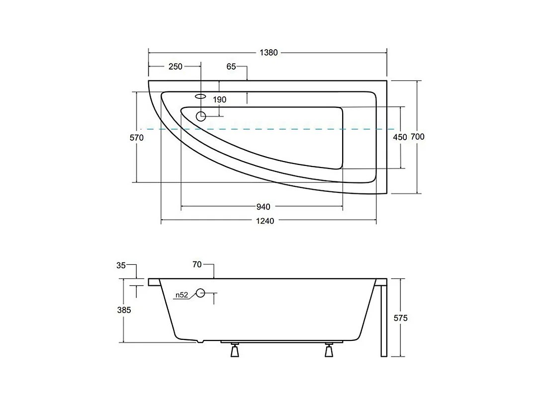 Baignoire asymétrique 150x70 Droite PRAKTIKA acrylique blanc, sans Habillage + Pieds + Vidage à chromé