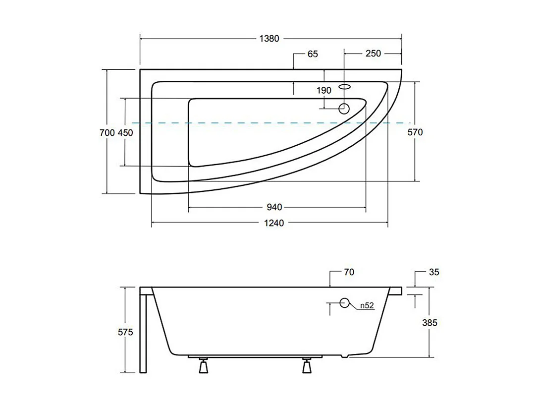 Baignoire asymétrique 140x70 Gauche PRAKTIKA acrylique blanc, sans Habillage + Pieds + Vidage à chromé