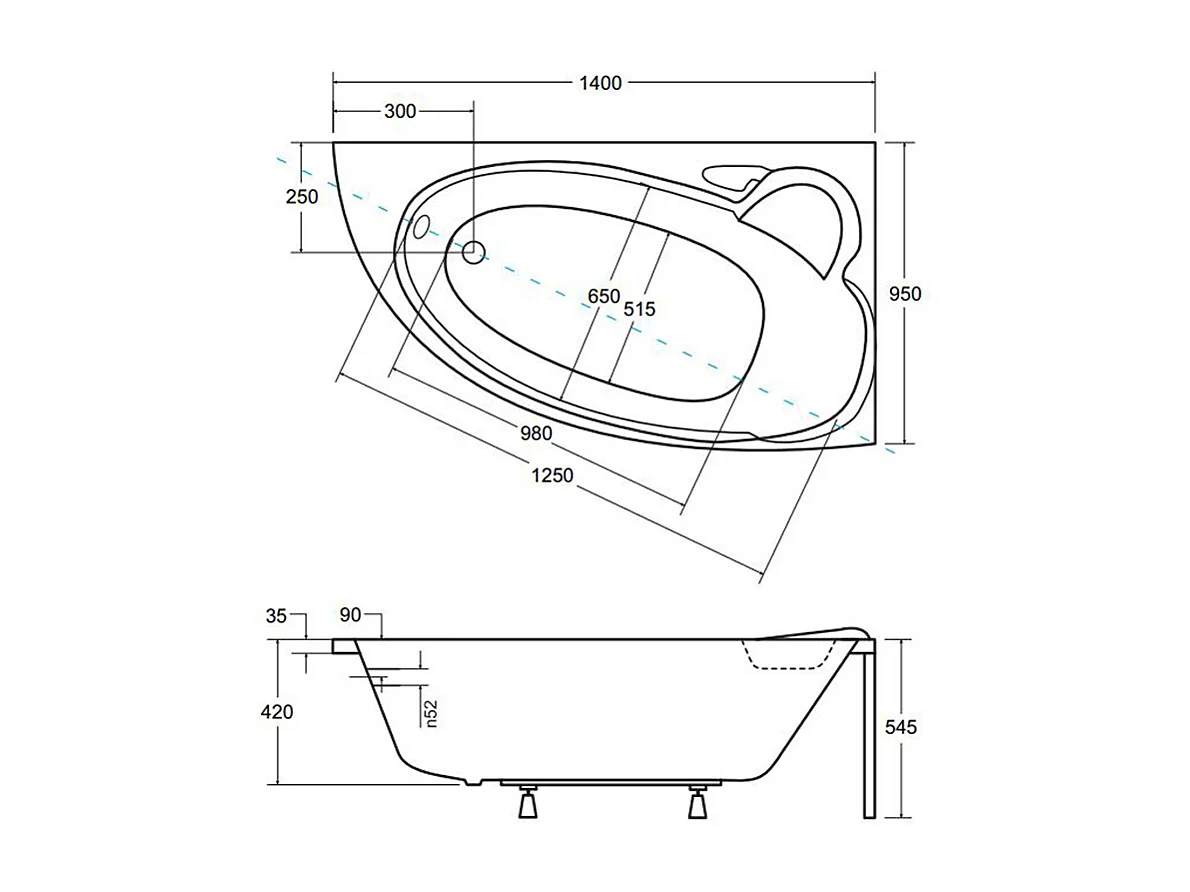 Baignoire asymétrique 140x90 Gauche RIMA acrylique blanc, sans Habillage + Pieds + Vidage à chromé