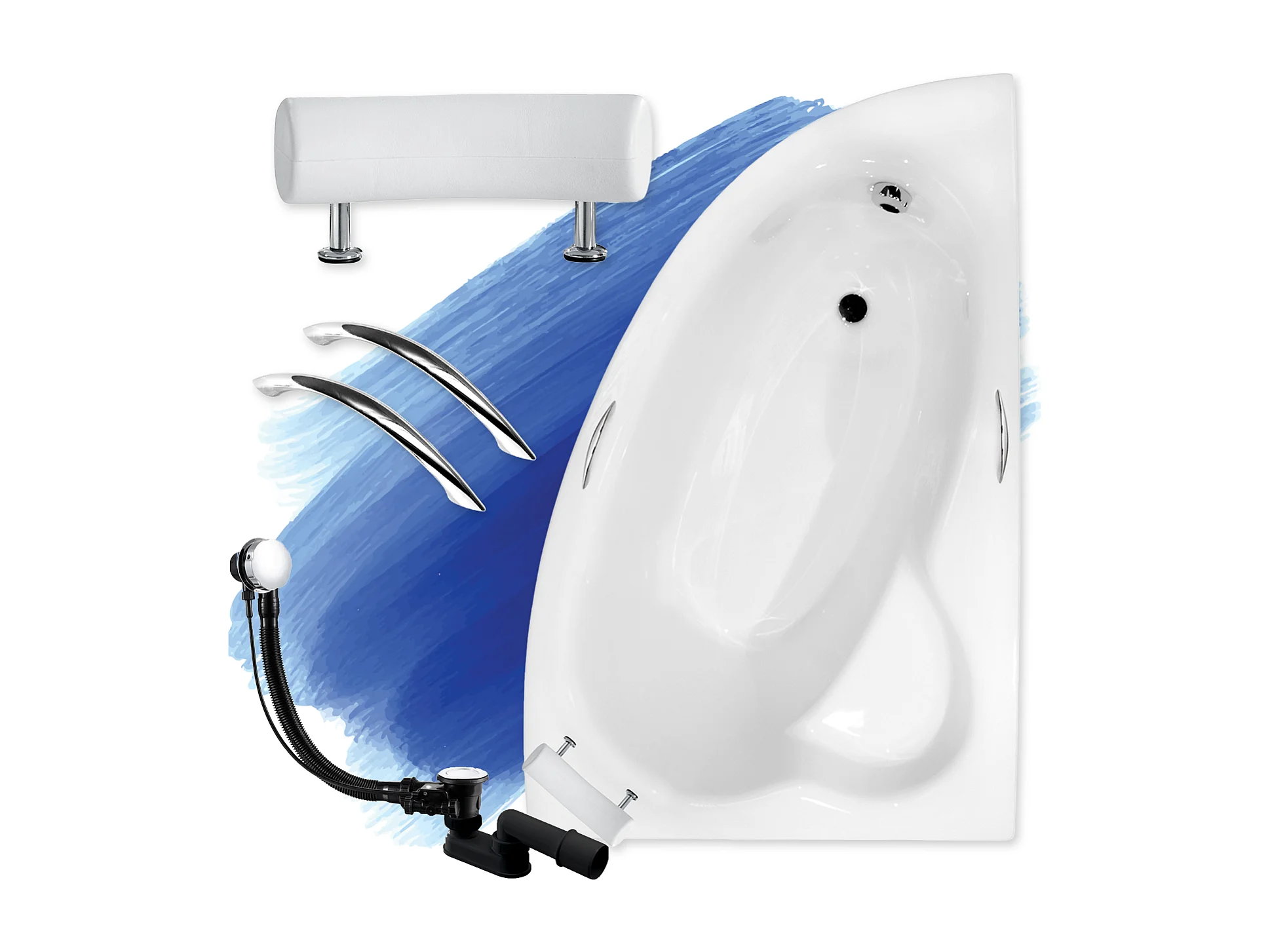 Baignoire asymétrique 150x100 Droite NATALIA PREMIUM acrylique blanc, sans Habillage + Poignées + Repose Tête + Pieds + Vidage à chromé