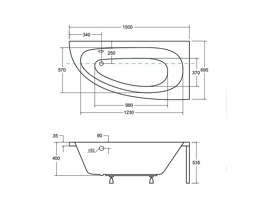 Baignoire asymétrique 150x70 Droite MILENA acrylique blanc, sans Habillage + Pieds + Vidage à chromé