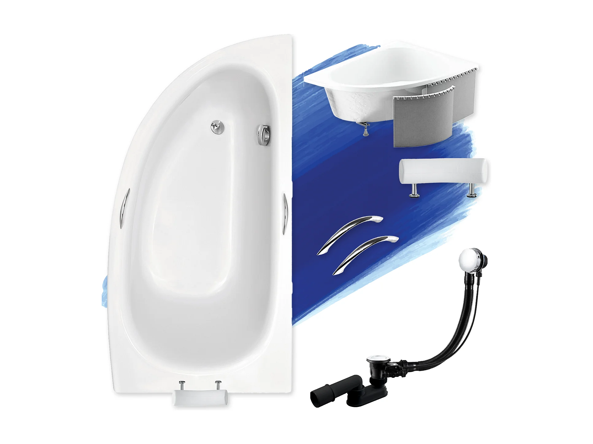 Baignoire asymétrique 150x70 Droite MILENA PREMIUM acrylique blanc + Habillage en polystyrène + Poignées + Repose Tête + Pieds + Vidage à chromé