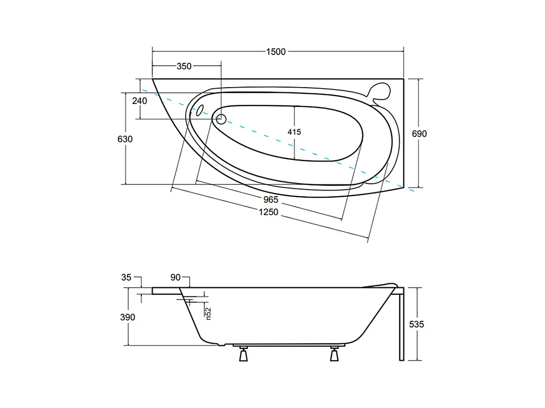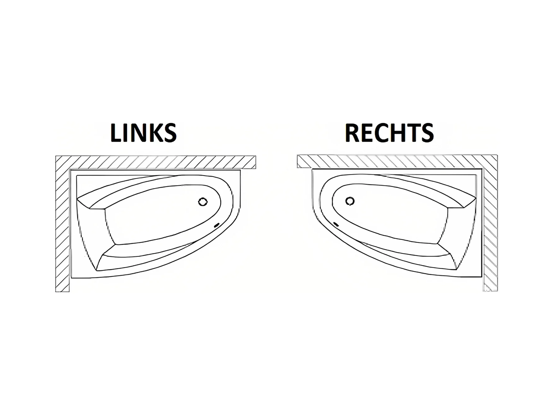 Baignoire asymétrique 150x70 Droite MINI acrylique blanc + avec Tablier + Pieds + Vidage à chromé