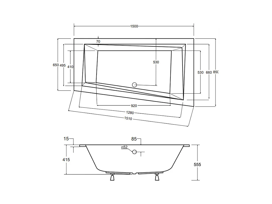 Baignoire asymétrique 150x85 Droite INTIMA SLIM acrylique blanc, sans Habillage + Pieds + Vidage à chromé