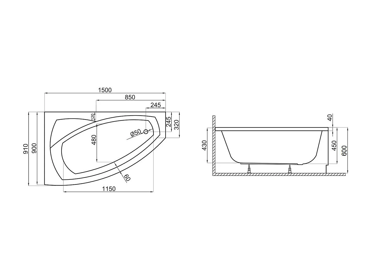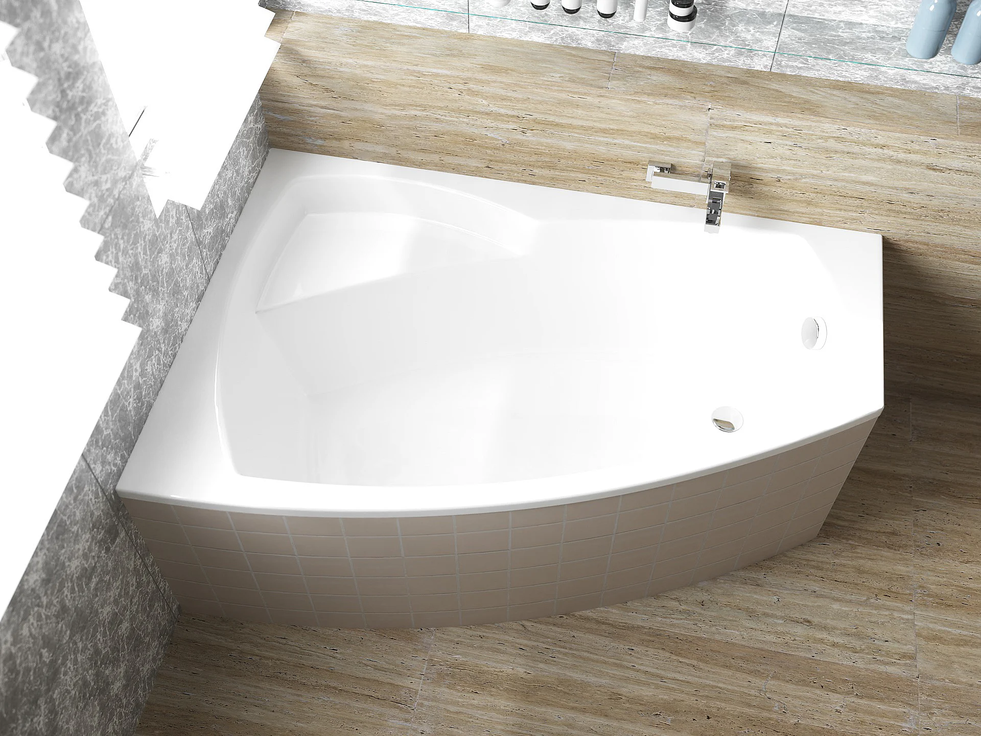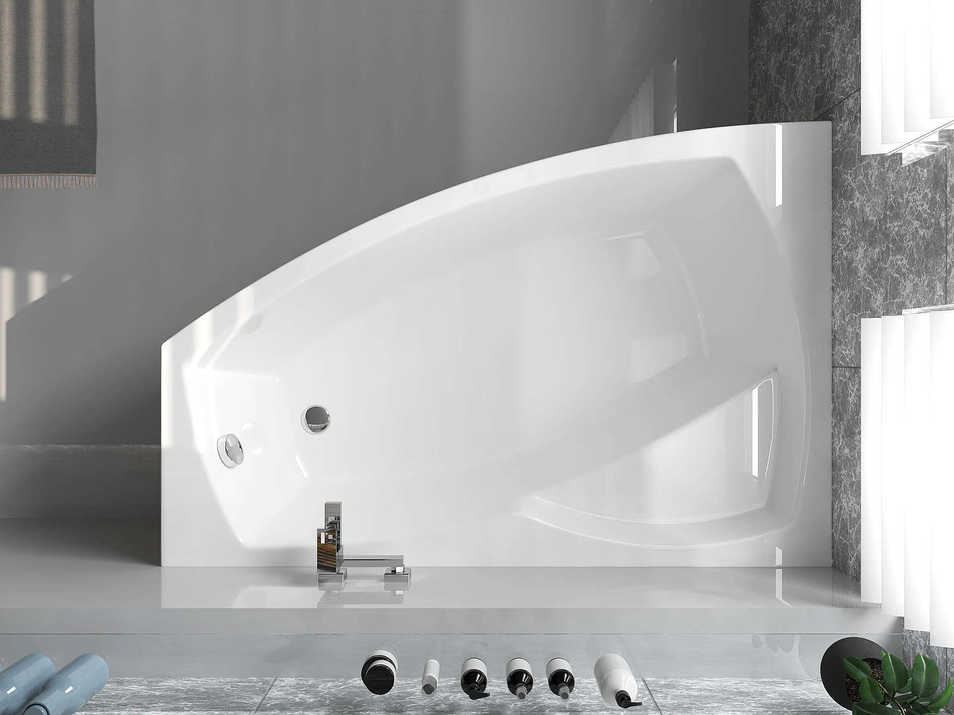 Baignoire asymétrique 150x90 Droite SELENA acrylique blanc, sans Habillage + Pieds + Vidage à chromé