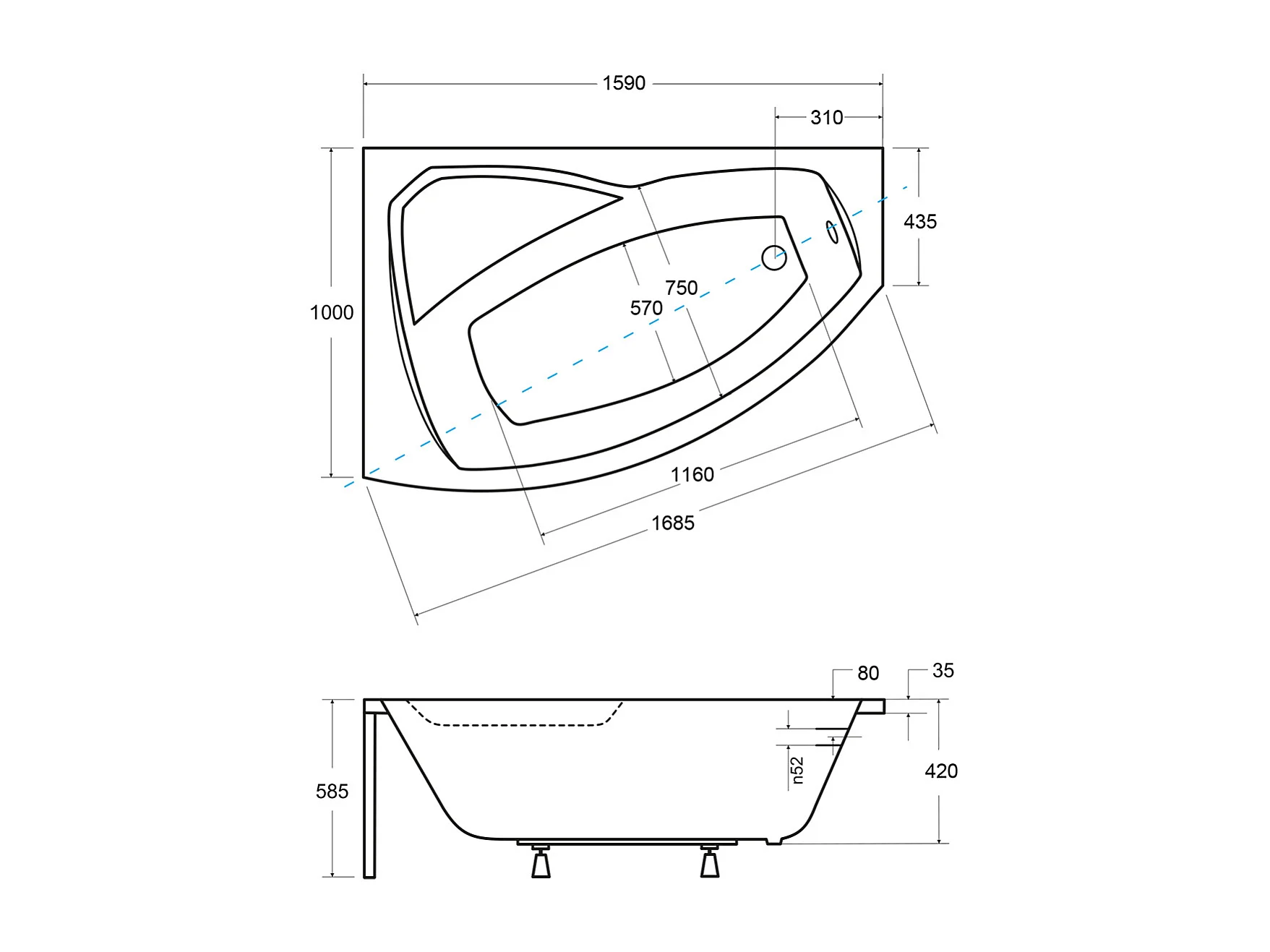 Baignoire asymétrique 160x100 Gauche RIMA acrylique blanc, sans Habillage + Repose Tête + Pieds + Vidage à chromé
