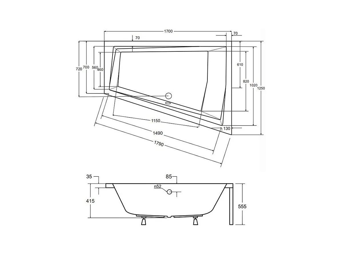 Baignoire asymétrique 170x125 Gauche INTIMA SLIM acrylique blanc, sans Habillage + Pieds + Vidage à chromé