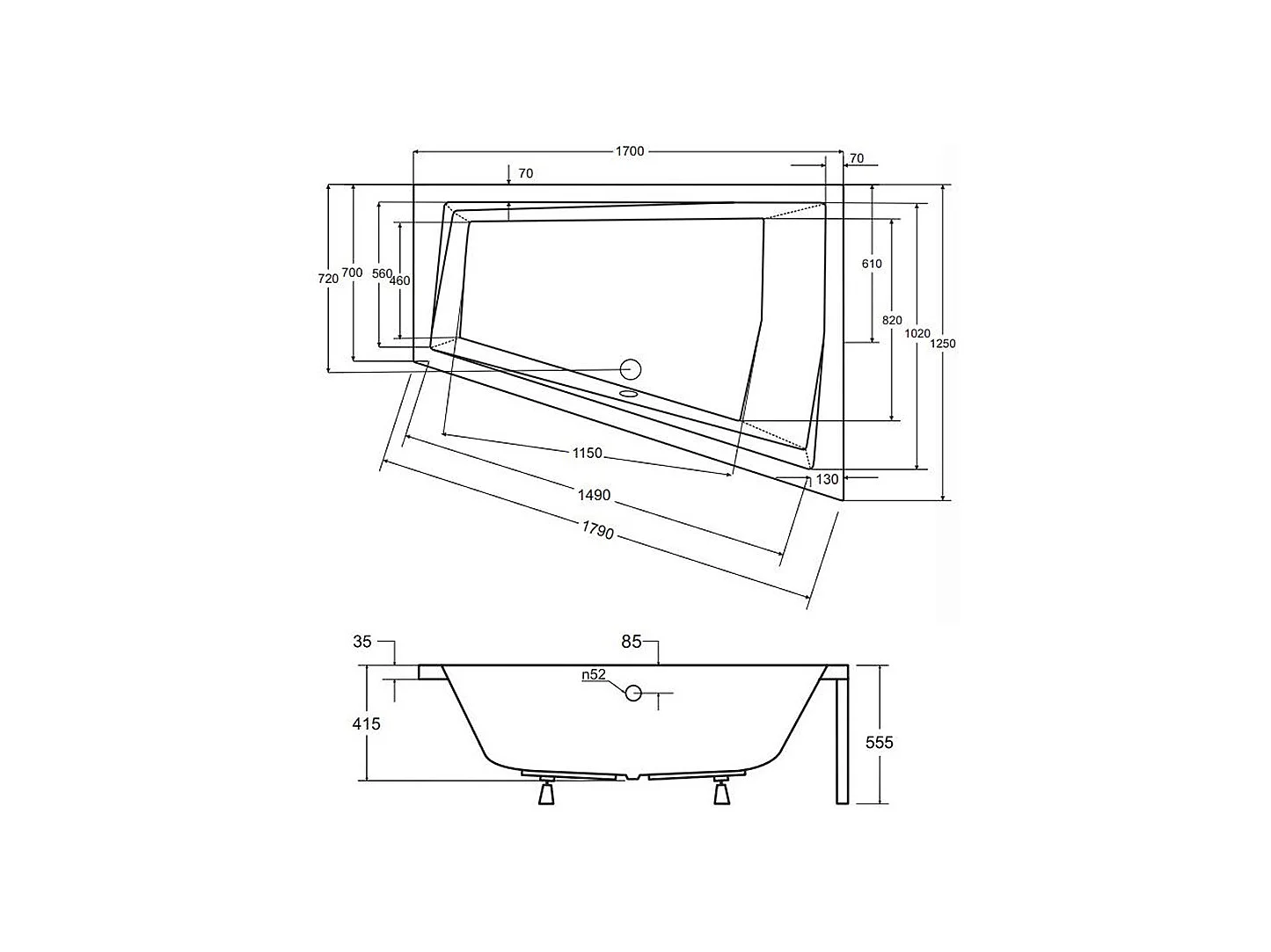 Baignoire asymétrique 170x125 Droite INTIMA SLIM acrylique blanc, sans Habillage + Repose Tête + Pieds + Vidage à chromé