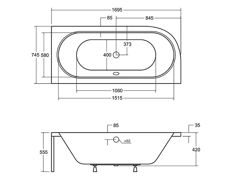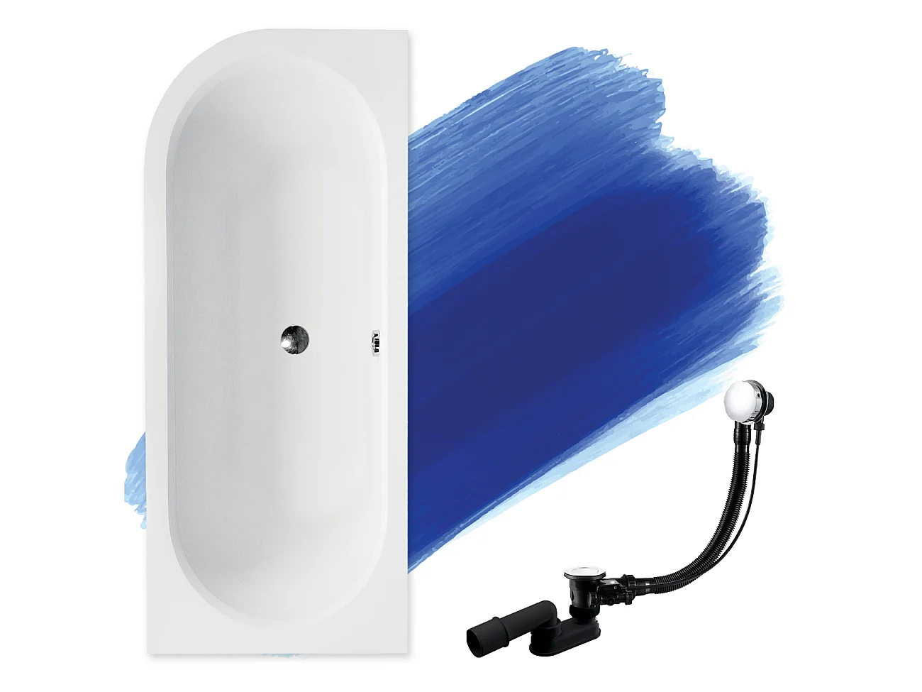 Baignoire asymétrique 170x75 Droite AVITA acrylique blanc, sans Habillage + Pieds + Vidage à chromé