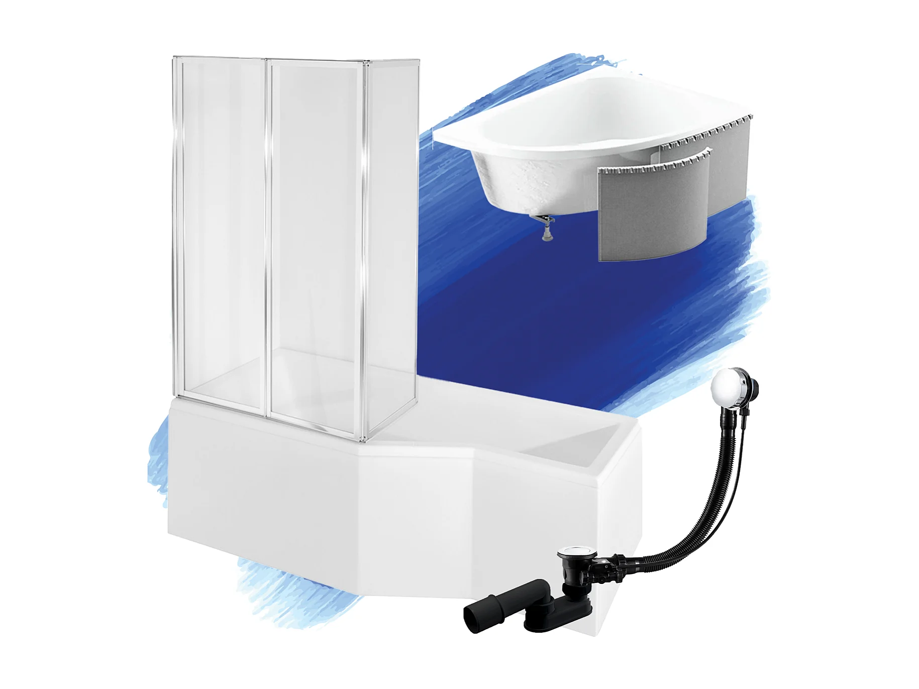 Baignoire asymétrique 170x75 Gauche INTEGRA acrylique blanc + Habillage en polystyrène + Écran + Pieds + Vidage à chromé