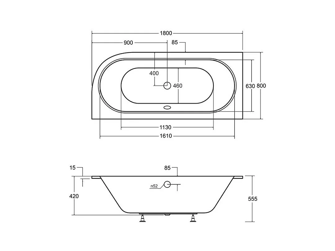 Baignoire asymétrique 180x80 Droite AVITA SLIM acrylique blanc, sans Habillage + Pieds + Vidage à chromé