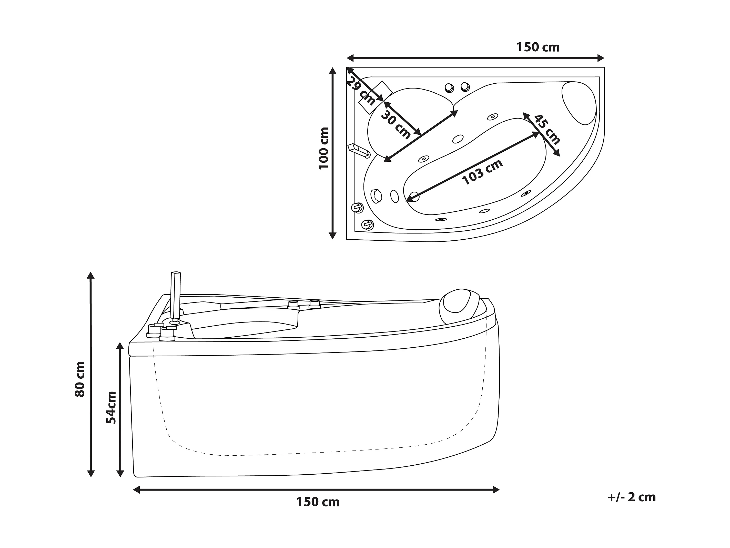 Baignoire d'angle à remous avec LED NEIVA Côté droit 150 x 100 cm Blanc