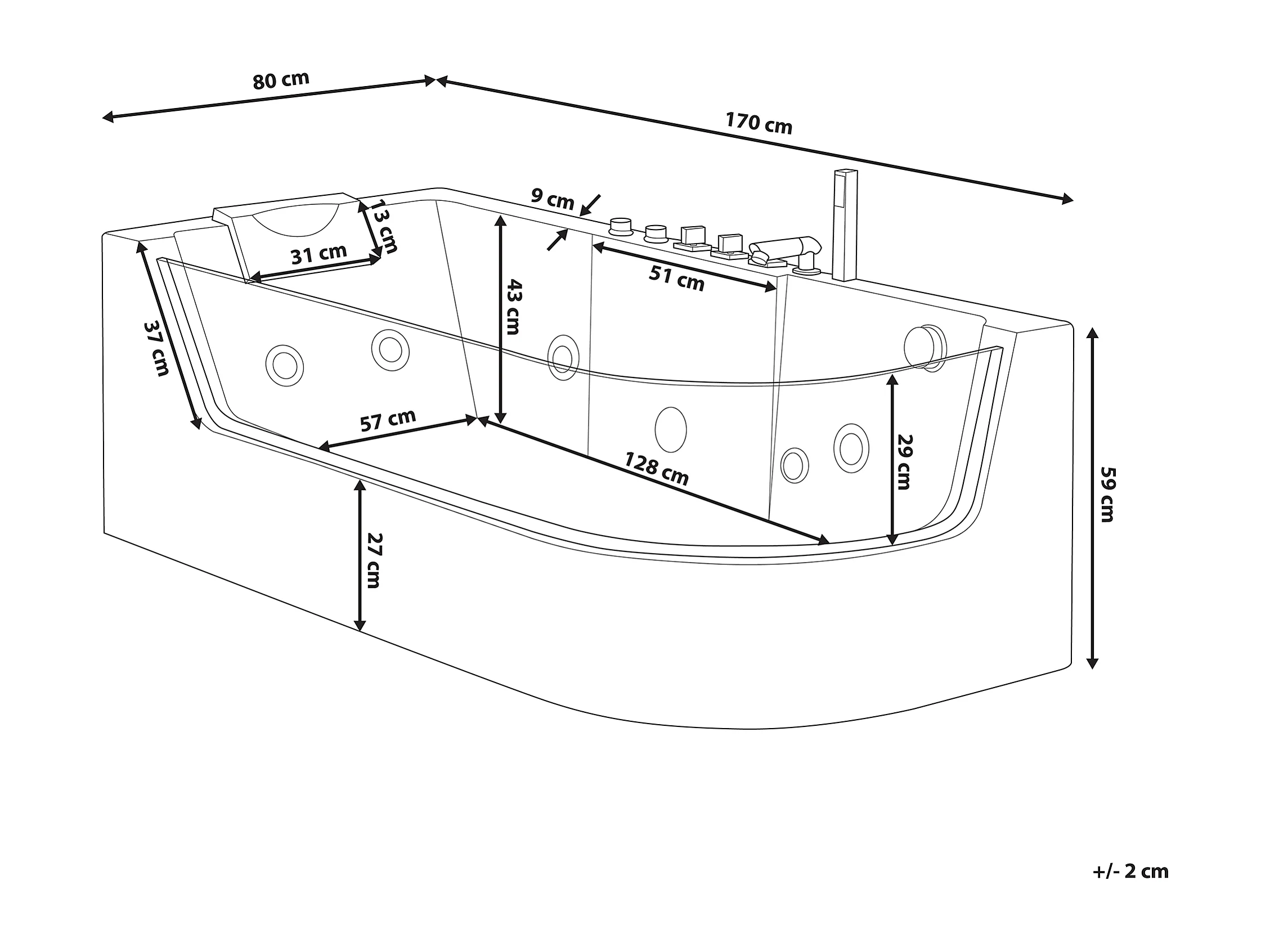 Baignoire d'angle à remous avec LED ACUARIO Côté droit 170 x 80 cm Blanc