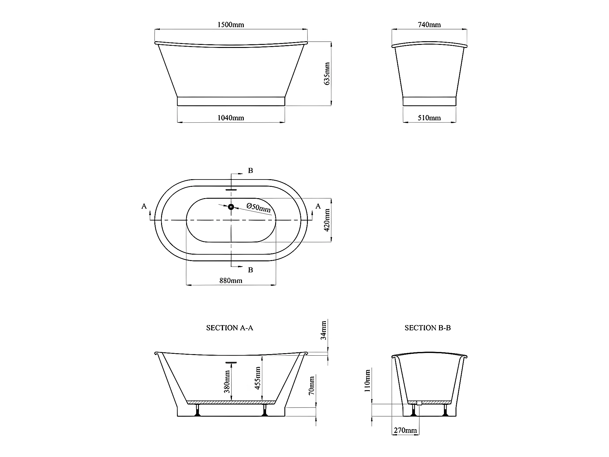 Baignoire îlot ovale - style retro - 180 L - 150 x 74 x 63 cm - Blanche - Acrylique - PELMATO
