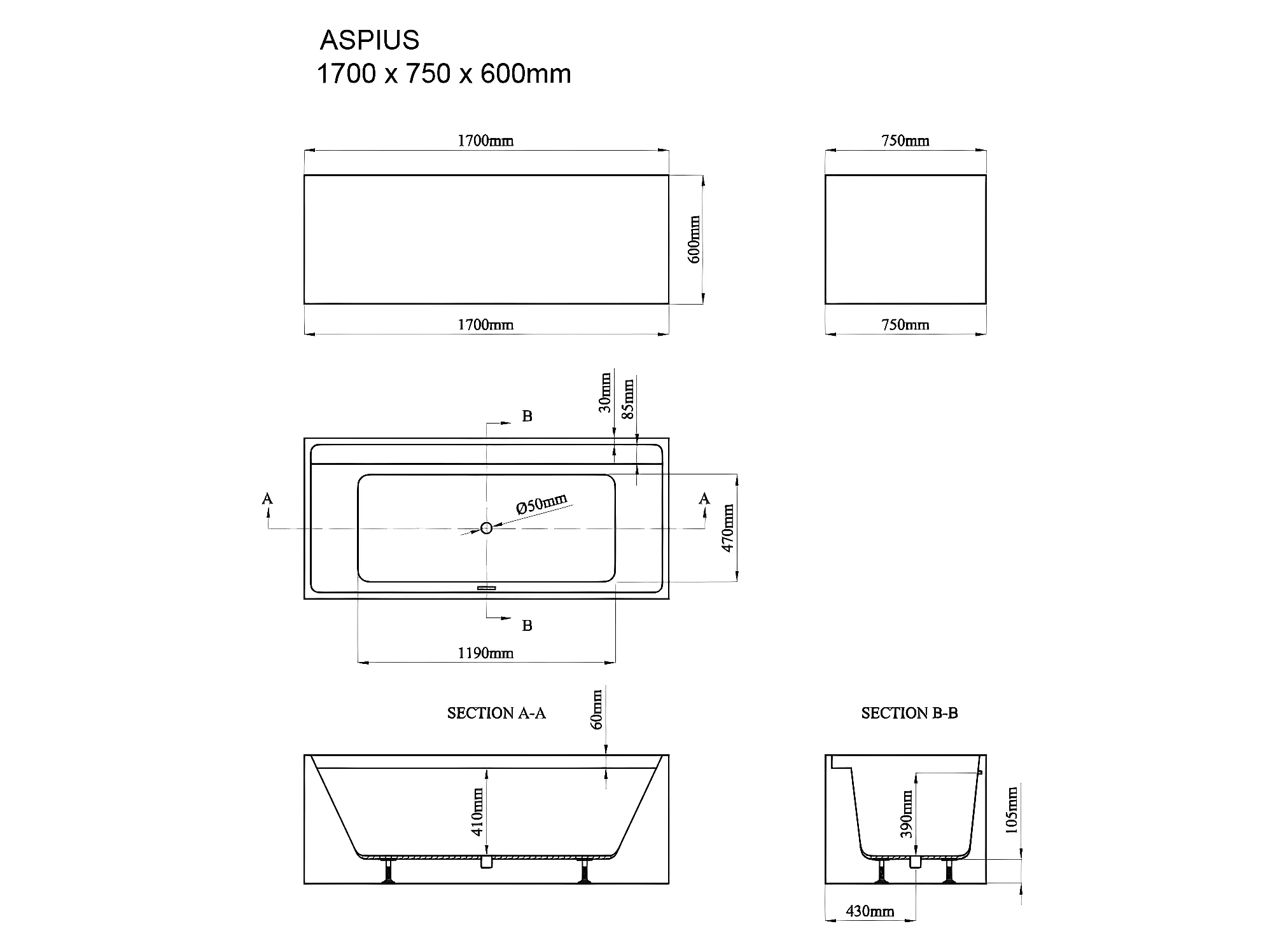 Baignoire îlot rectangulaire - 280 L - 170 x 75 x 60 cm - Blanche - Acrylique - ASPIUS
