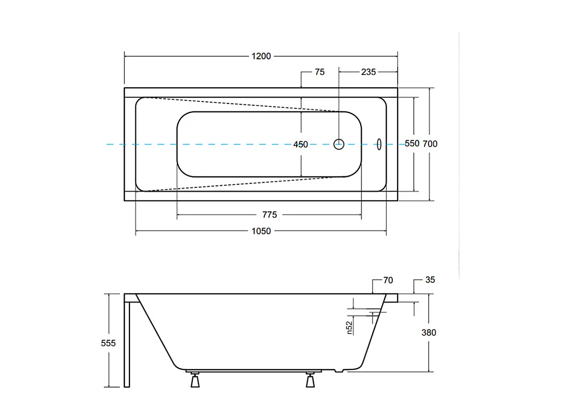 Baignoire rectangulaire 120x70 TALIA acrylique blanc, sans Habillage + Pieds + Vidage à chromé
