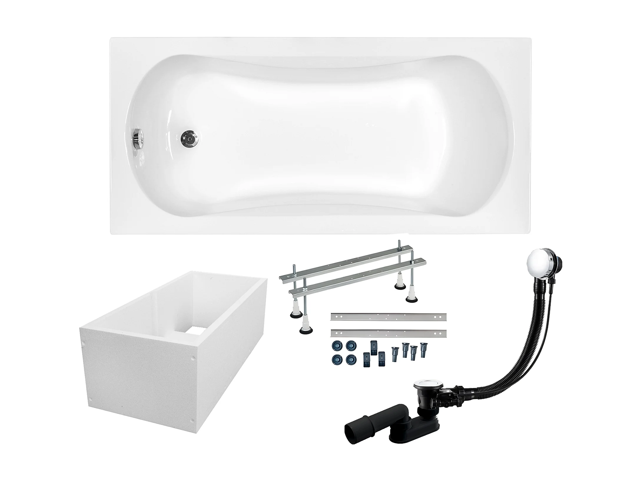 Baignoire rectangulaire 130x70 ARIA acrylique blanc + Support stabilisateur en polystyrène + Pieds + Vidage à chromé
