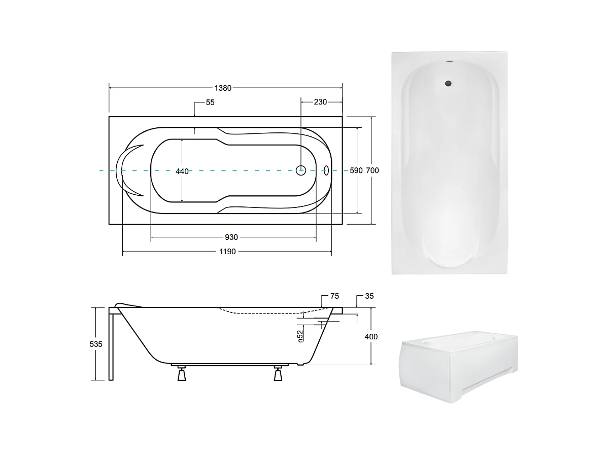 Baignoire rectangulaire 140x70 BONA acrylique blanc, sans Habillage + Repose Tête + Étagère bambou + Pieds + Vidage à chromé