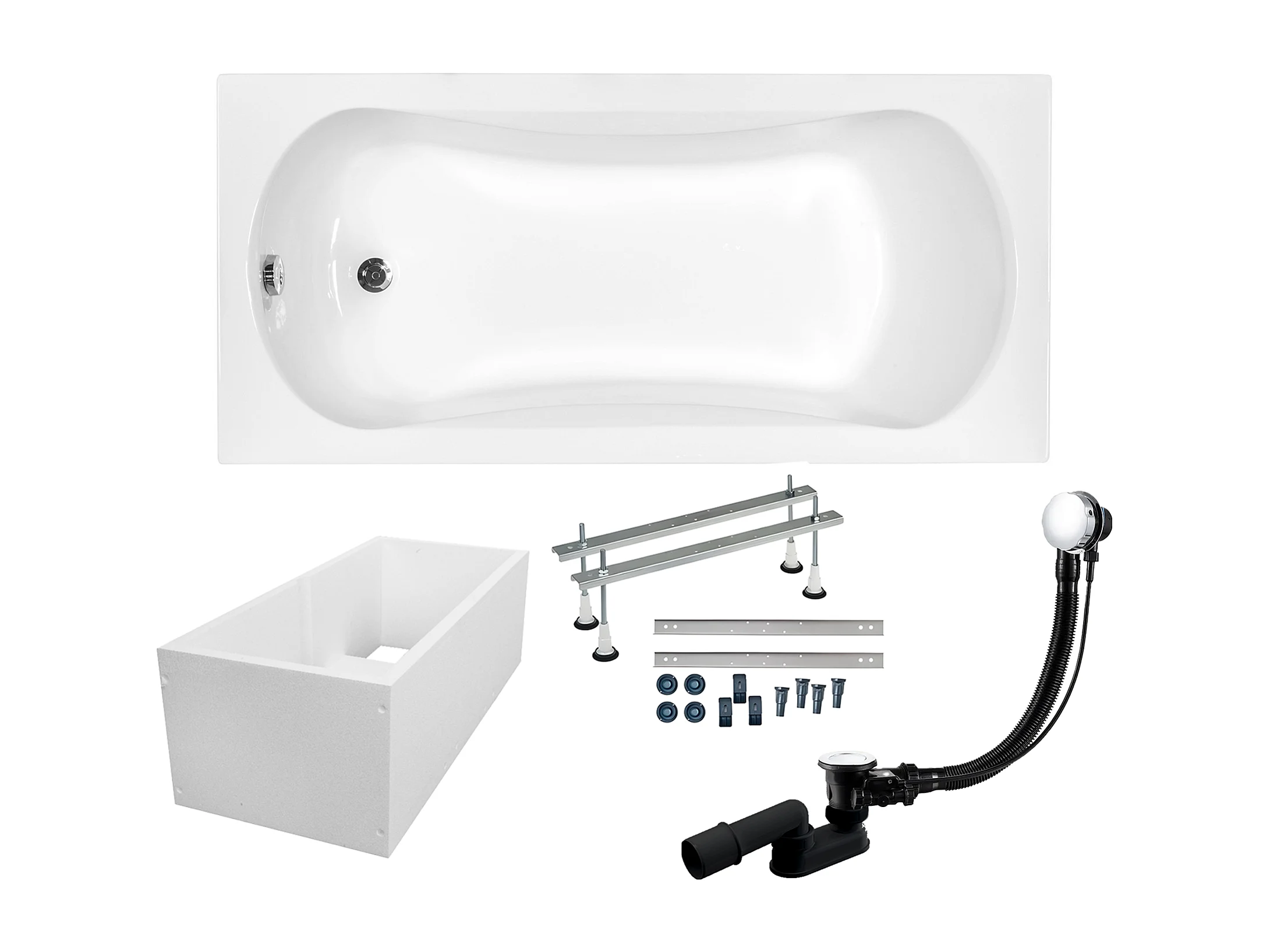 Baignoire rectangulaire 150x70 ARIA acrylique blanc + Support stabilisateur en polystyrène + Pieds + Vidage à chromé