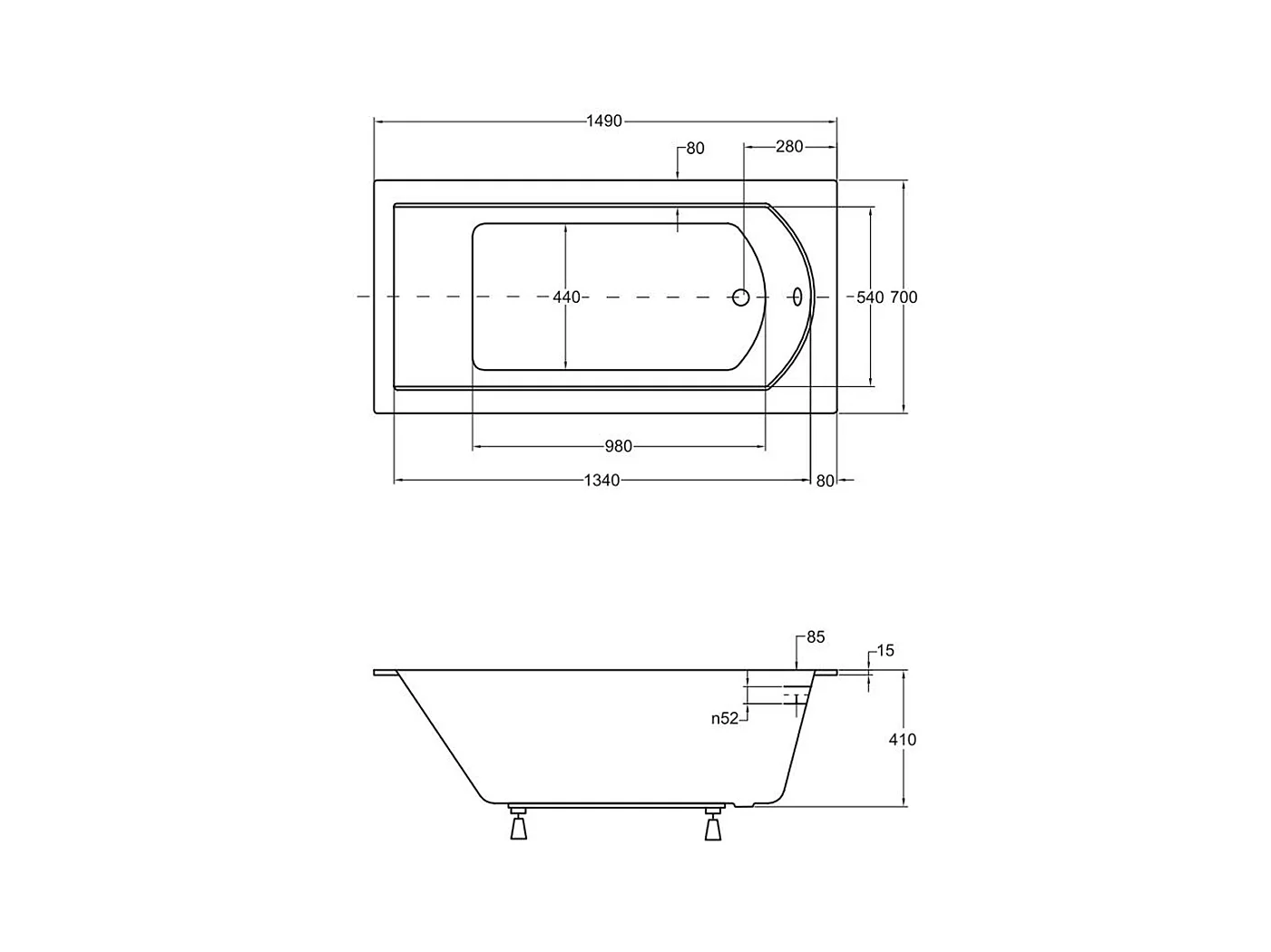 Baignoire rectangulaire 150x70 MODERN acrylique blanc, sans Habillage + Pieds + Vidage à chromé