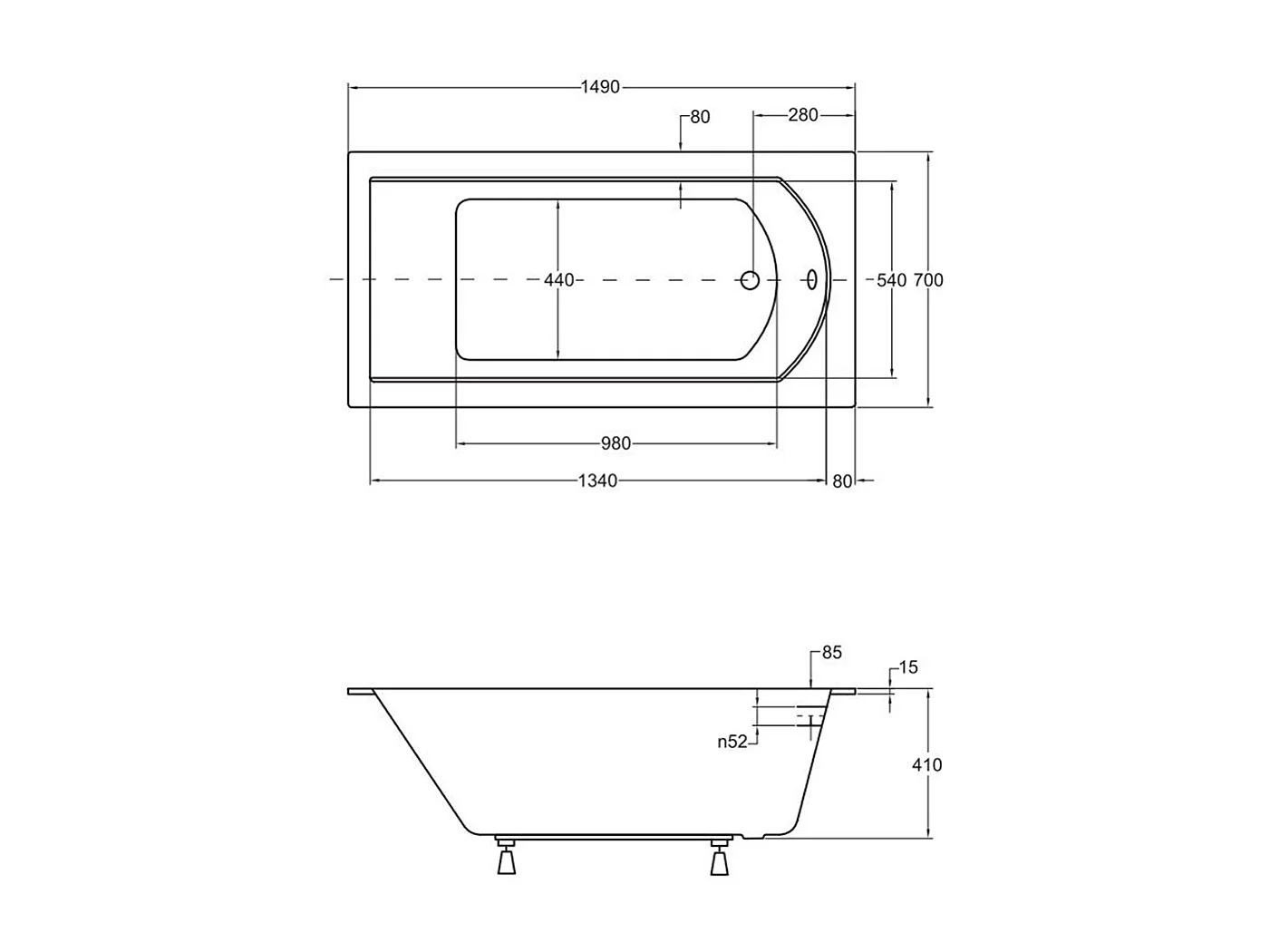 Baignoire rectangulaire 150x70 OPTIMA acrylique blanc, sans Habillage + Pieds + Vidage à chromé