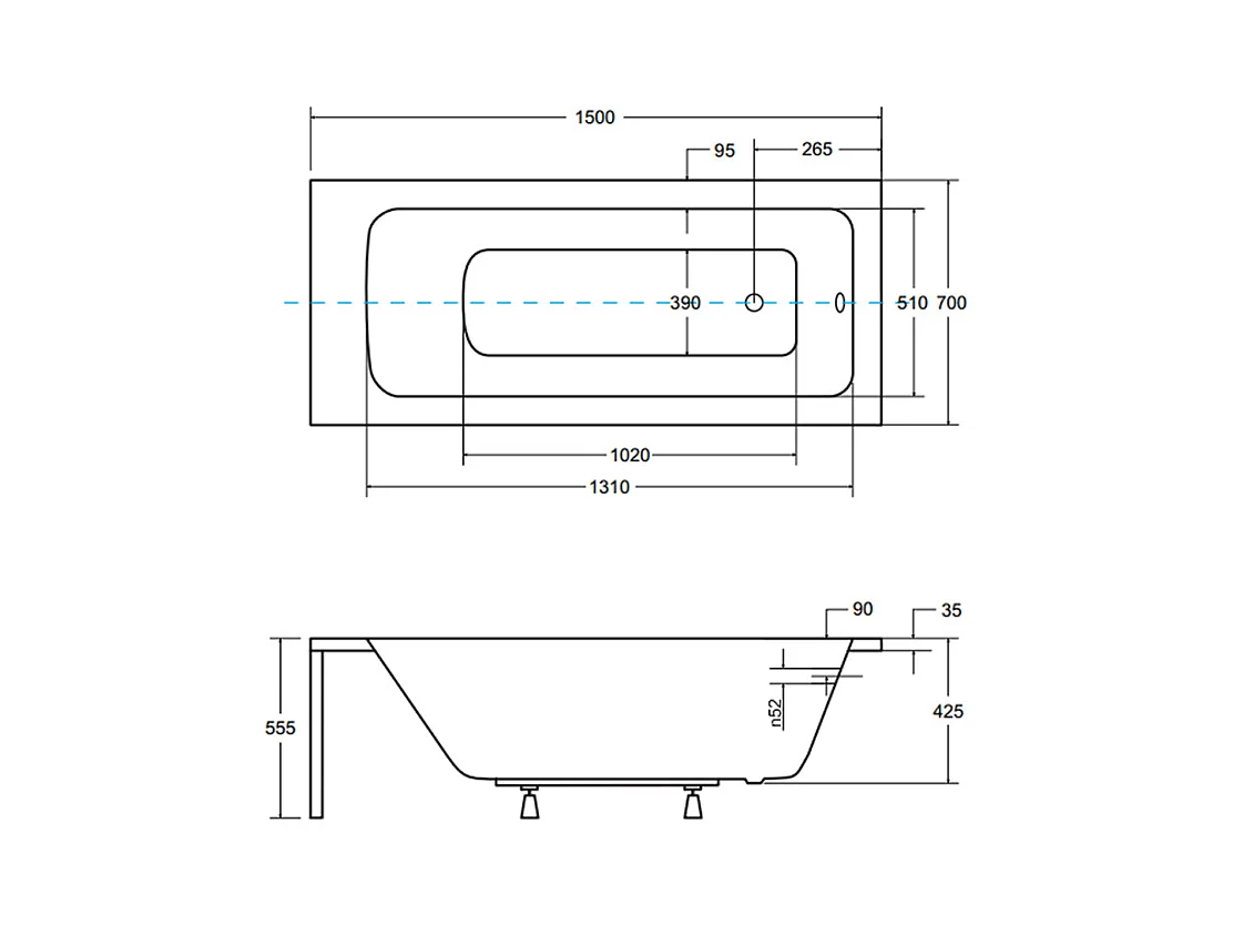 Baignoire rectangulaire 150x70 TALIA SLIM acrylique blanc, sans Habillage + Pieds + Vidage à chromé
