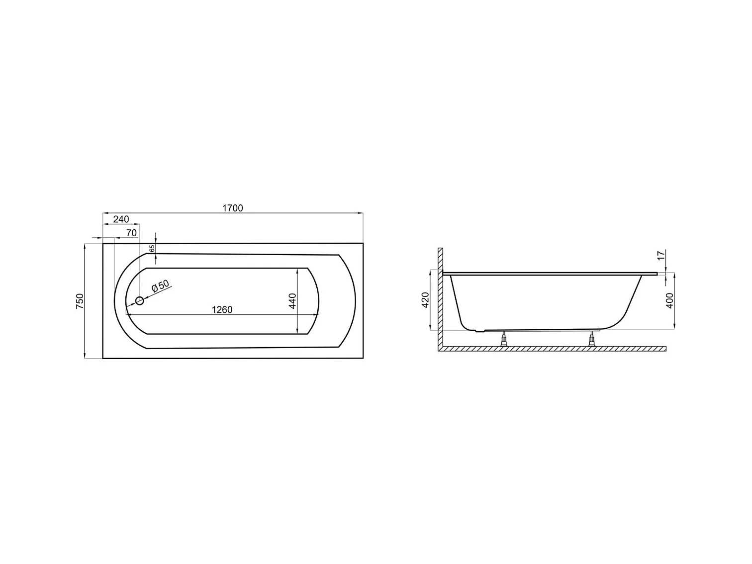 Baignoire rectangulaire 170x75 CLASSIC acrylique blanc, sans Habillage + Pieds + Vidage à chromé