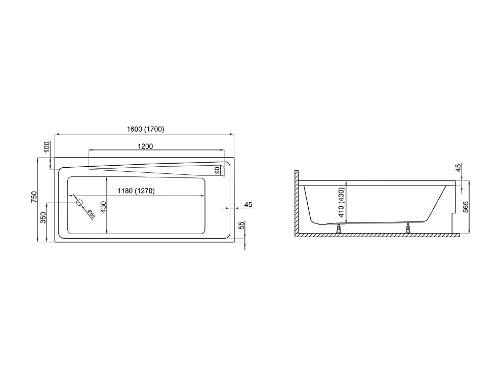 Baignoire rectangulaire 170x75 ELZA acrylique blanc + avec Tablier + Pieds + Vidage à chromé