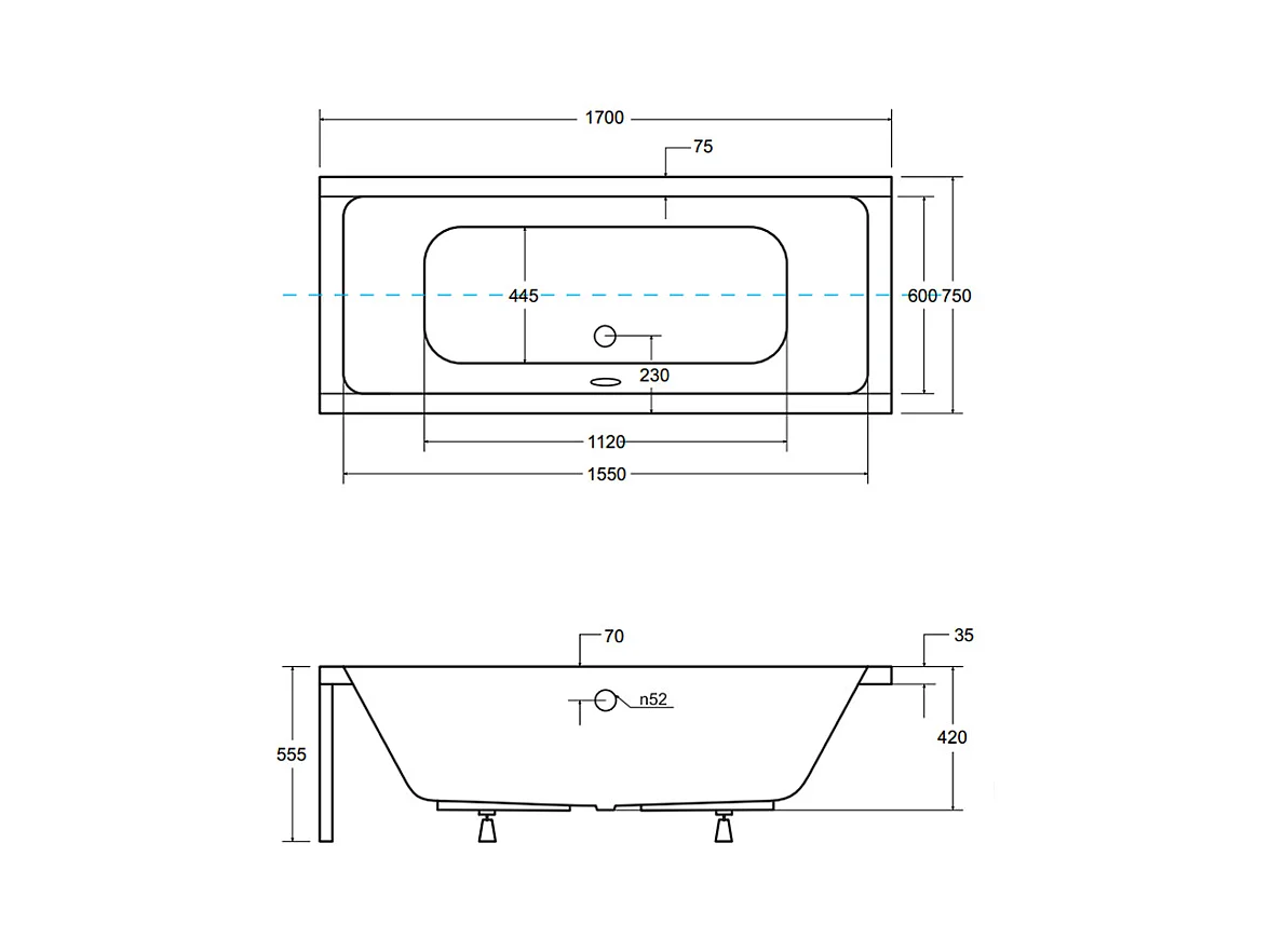 Baignoire rectangulaire 170x75 VITAE acrylique blanc, sans Habillage + Pieds + Vidage à chromé