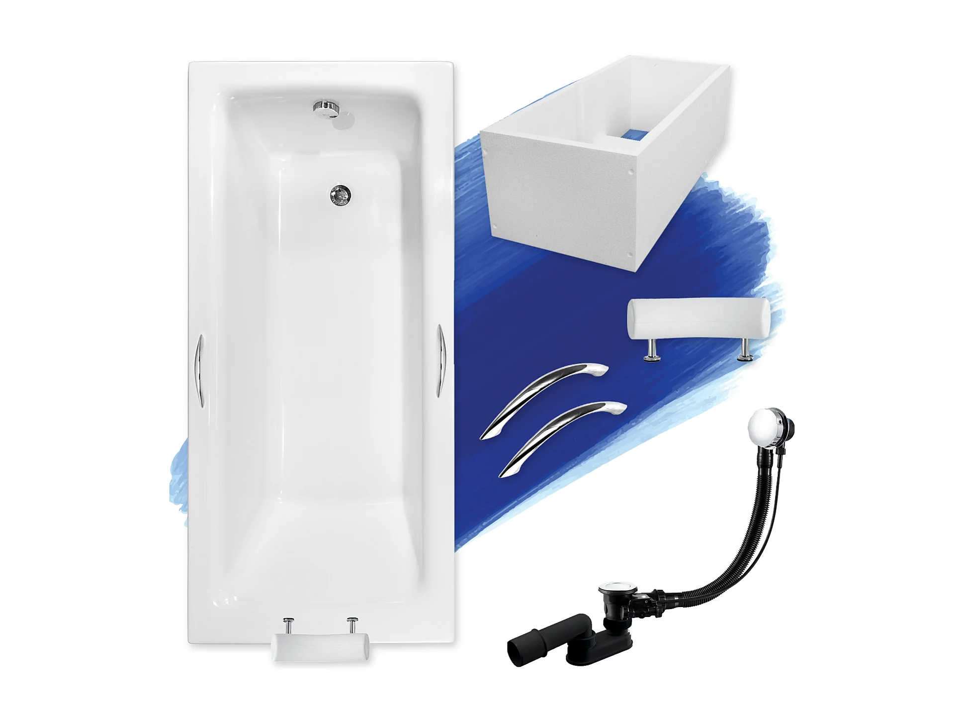 Baignoire rectangulaire 170x75 TALIA PREMIUM acrylique blanc + Support stabilisateur en polystyrène + Poignées + Repose Tête + Pieds + Vidage à chromé