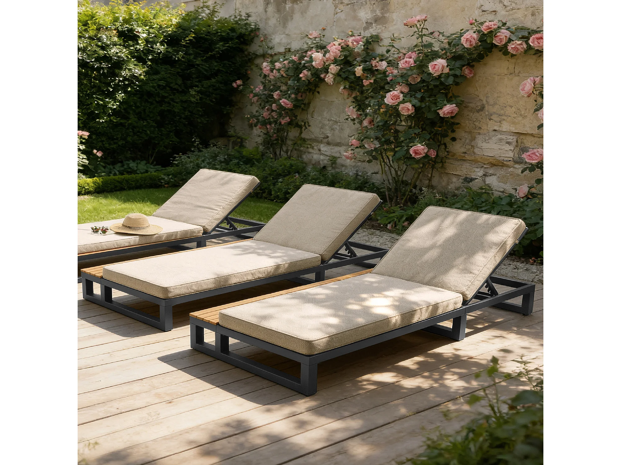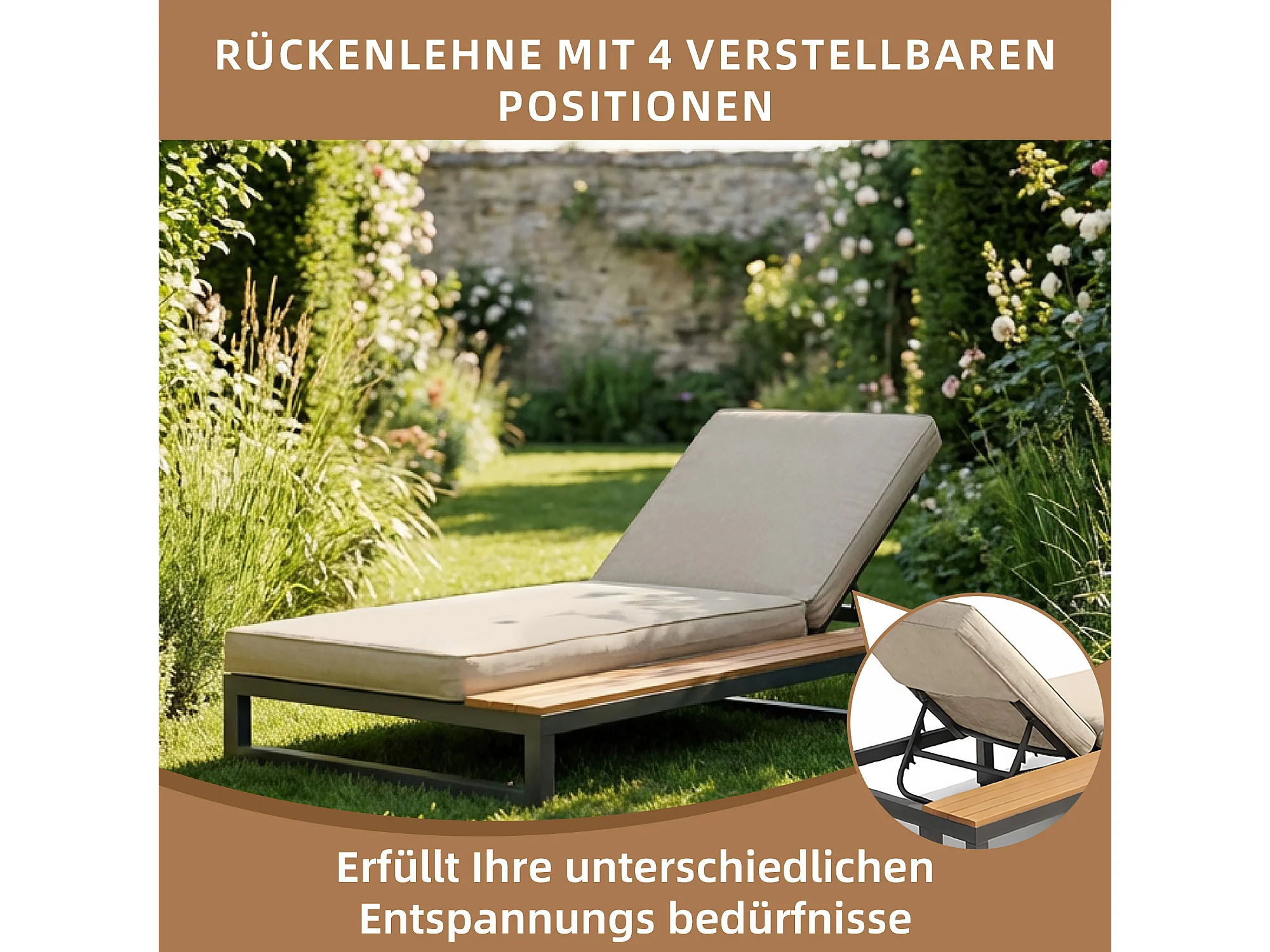 Bain de soleil d'extérieur 1 place - 184 x 79.5 x 73 cm - Lit de jour avec étagère à droit - dossier inclinable - métal + bois - beige
