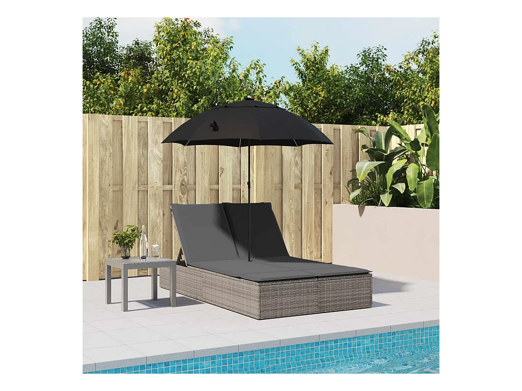 Bain de soleil double et coussins et parasol gris résine tressée FR367494