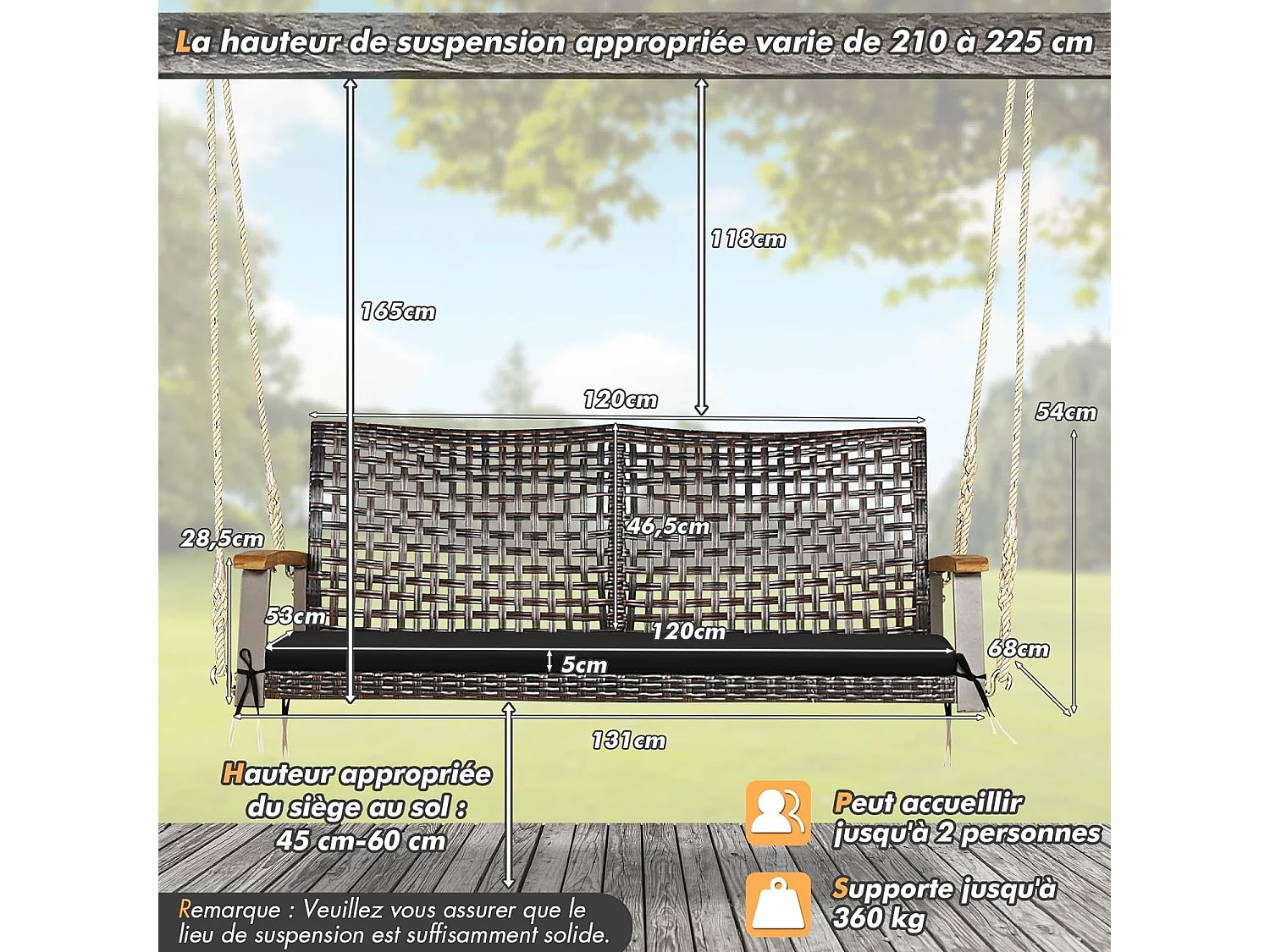 Balançoire de Jardin en Rotin et fibre naturelle à 2 Places, Balancelle de Porche en Osier avec Accoudoir en Bois d'Acacia et Coussin, Banc Suspendu avec 2 Cordes de Suspension de 300 CM, Charge 360 KG (Coussin en Noir)